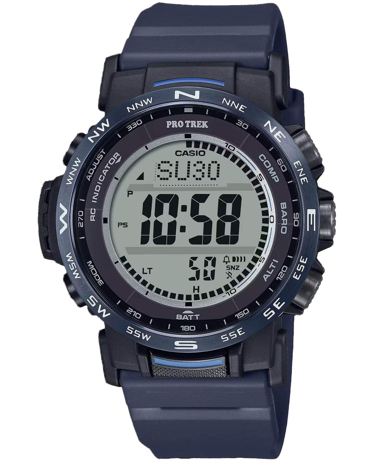 Японские мужские часы-хронографХронографФункция позволяет измерять отрезки времени с особой точностью: часы, минуты, секунды. Верным признаком хронографа является наличие на циферблате 3 дополнительных окошек-счётчиков. Casio Pro Trek PRW-35Y-2. Перед вами эволюционный релиз в линейке Pro Trek — стильная и функциональная цифровая модель из серии PRW-35 в черном полимерном корпусе с инверсионным дисплеем на мягком и прочном ремешке из биополимера. Часы созданы для путешествий, хайкинга и активного времяпровождения на природе. Минеральное стеклоМинеральное стеклоМинеральное стекло представляет собой искусственно выращенный минерал кварца. Такое стекло отличается особой устойчивостью к повреждениям и царапинам. Уступает по некоторым качествам сапфировому стеклу. устойчивое к появлению царапин, обладающее высокой прозрачностью. Корпус часов изготовлен из стали с IP-покрытиемIP-покрытиеМетод ионного напыления. Демонстрирует повышенную устойчивость к истиранию, окислению и химическим веществам. Под воздействием высокого давления и температуры около 1500°C молекулы металла надёжно соединяются с частицами корпуса часов.и биопластика, который изготавливается из возобновляемых органических ресурсов. Питание от солнечной энергии Tough SolarTough SolarТехнология основана на подзарядке аккумулятора от источника солнечного света, специальная панель улавливает солнечные лучи и преобразует их в энергию для работы часов. Достаточно пары минут нахождения на солнце для функционирования часов в течении суток.- солнечные батарейки большой мощности, индикатор заряда батареи. Функция автоматического сохранения энергии. Время работы аккумулятора без подзарядки - 6 месяцев, при включенной функции сохранения энергии - 22 месяца. Модуль часов рассчитан на работу при низких температурах до -10°С/14°F. Циферблат подсвечивается ярким светодиодомСветодиодная подсветкаСветодиодная или LED-подсветка обеспечивает появление яркого холодного свечения за счёт LED-элементов - маленьких лампочек. Они потребляют минимальное количество энергии, чаще всего можно встретить 1 светодиод, в нижней части циферблата., при недостаточном освещении во время поворота запястья в сторону лица подсветка включается автоматически. Настраиваемое послесвечение 1,5 или 3сек. Цвет подсветки: белый. 12-ти и 24-х часовой формат времени. СекундомерСекундомерСекундоме́р — прибор, способный измерять интервалы времени с точностью до долей секунды. с точностью показаний 1/10с и временем измерения 1000ч. Сплит-хронографСплит-хронографИспользуется для измерения продолжительности нескольких временных отрезков, начинающихся одновременно, а заканчивающихся в разное время.. ТаймерТаймерОтсчитывает секунды в обратном направлении в заданном интервале времени. обратного отсчета от 1мин до 24ч. Мировое времяМировое время Полезное часовое усложнение, отображающее время в основных городах и известных областях по всему миру, оно связано с часовыми поясами, удобно для путешественников и бизнесменов. – 48 городов. Переключение между домашним и мировым временем. Время восхода и захода Солнца на определенную дату. Технология Multi Band 6 позволяет принимать сигналы от шести радиовышек, расположенных в различных точках земного шара, которые передают временные сигналы от определенных атомных часов. Коррекция текущ