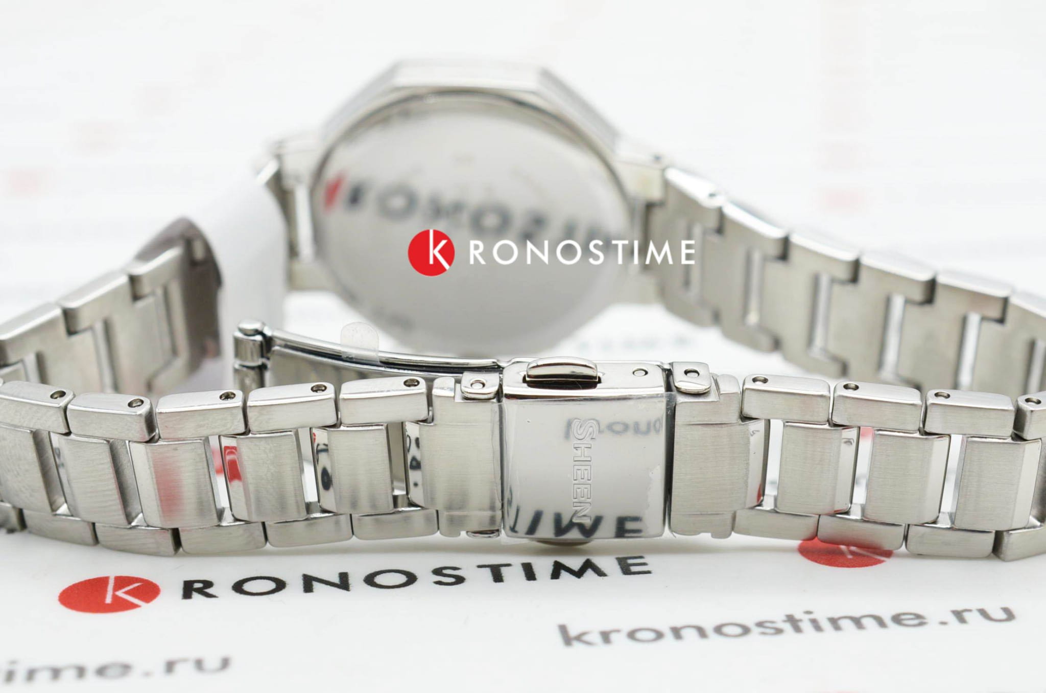 Женские японские часы Casio Sheen SHE-4543D-7A, кварцевый механизм с высокой точностью. Класс водозащиты: 50 метров, позволит защитить корпус от случайных брызг или капель дождя. Корпус изготовлен из нержавеющей стали. БезельБезельВнешний ободок, закрепляющий стекло. В спортивных часах так называется поворотное кольцо с делениями на циферблате, выполняет роль таймера – замеряет отрезки времени на шкале. Неподвижный безель – элемент декора. Однонаправленно вращающийся безель на дайверских часах позволяет фиксировать моменты погружения и выныривания на поверхность. украшен 4-мя кристаллами. Окошко даты на отметке 6 часов. Полированный литой стальной браслет имеет раскладывающуюся застежкуРаскладная застёжкаТакой тип застёжки используется только на браслетах из металла. Она никогда не раскрывается полностью, происходит разделение на 2 и более частей. Раскладывающая застёжка снизит вероятность потери часов к минимуму.. Метки в виде штрихов.