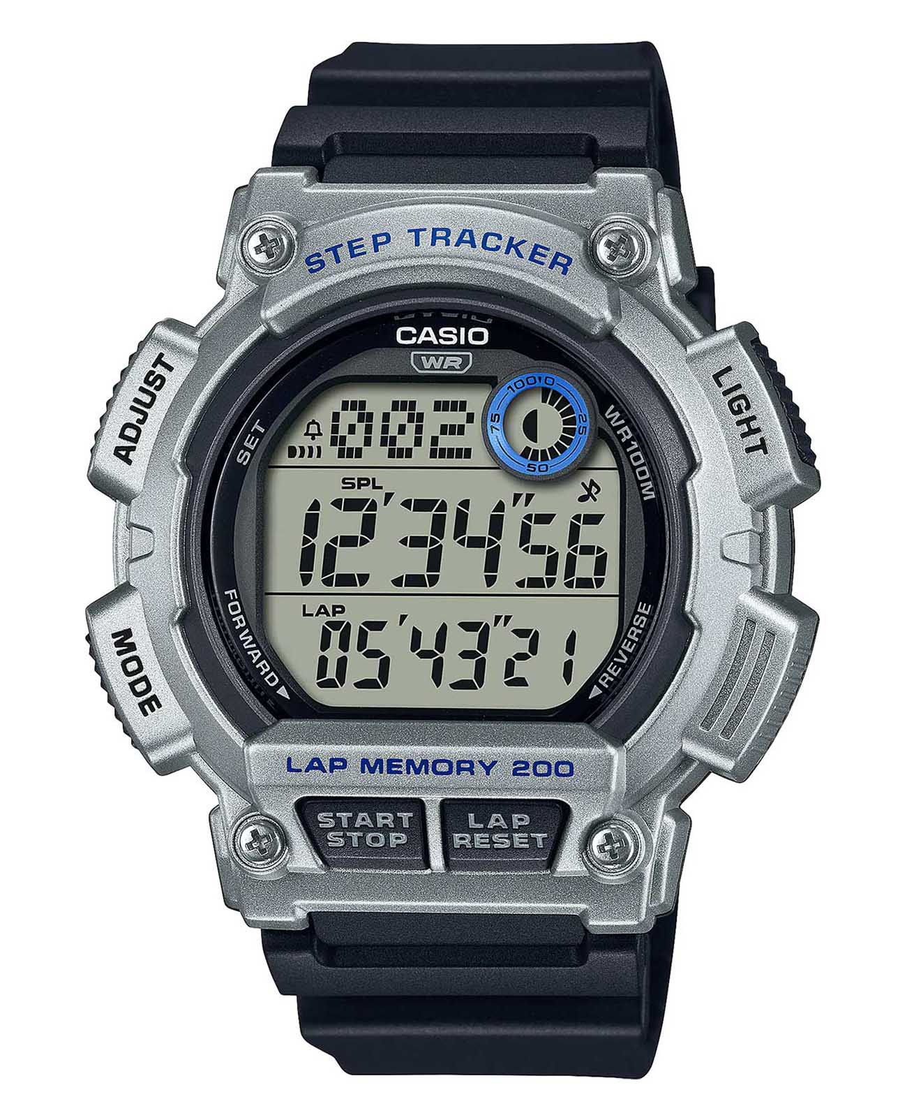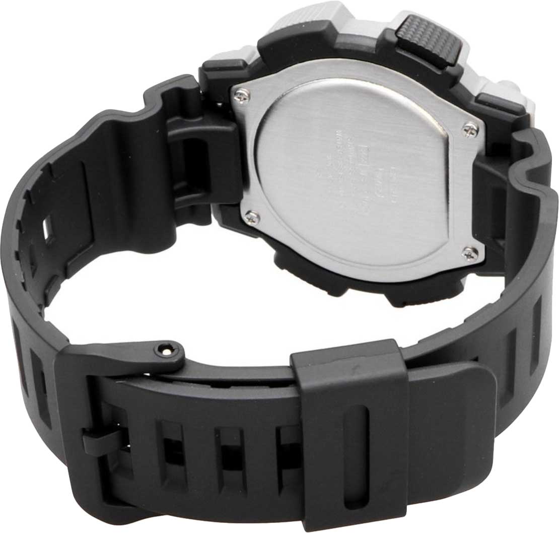 Японские мужские наручные часы Casio WS-2100H-1A2 c кварцевым механизмом высокой точности. Корпус часов изготовлен из полимерного пластика серебристого цвета. Функции: Сплит-хронографСплит-хронографИспользуется для измерения продолжительности нескольких временных отрезков, начинающихся одновременно, а заканчивающихся в разное время., второй часовой пояс, ШагомерШагомерШагоме́р или педо́метр — измерительный прибор для подсчёта количества сделанных шагов (или пар шагов) при ходьбе или беге., Мировое времяМировое время Полезное часовое усложнение, отображающее время в основных городах и известных областях по всему миру, оно связано с часовыми поясами, удобно для путешественников и бизнесменов. , светодиодная подсветкаСветодиодная подсветкаСветодиодная или LED-подсветка обеспечивает появление яркого холодного свечения за счёт LED-элементов - маленьких лампочек. Они потребляют минимальное количество энергии, чаще всего можно встретить 1 светодиод, в нижней части циферблата., секундомерСекундомерСекундоме́р — прибор, способный измерять интервалы времени с точностью до долей секунды., таймерТаймерОтсчитывает секунды в обратном направлении в заданном интервале времени., будильникБудильникБуди́льник — часы, в заданный момент времени подающие звуковой, световой и/или в редких случаях другой сигнал., автоматический календарь, 12/24 отображение времени. Органическое стекло, корпус и ремешок из полимерного пластика, водонепроницаемость (10 бар). Габариты (Ш x В x Г) 48,1 х 49,9 х 14,6. Вес 47 г.