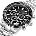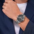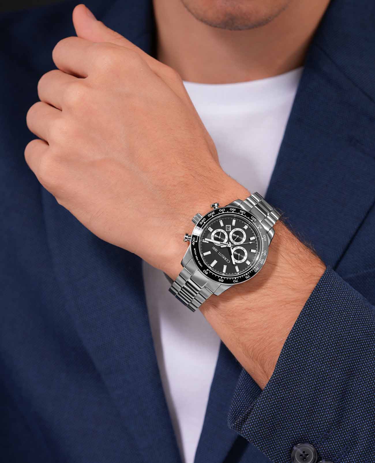 Французские мужские часы-хронографХронографФункция позволяет измерять отрезки времени с особой точностью: часы, минуты, секунды. Верным признаком хронографа является наличие на циферблате 3 дополнительных окошек-счётчиков. Cerruti 1881 Turchino CIWGI0028301, кварцевый механизм с высокой точностью. Минеральное стеклоМинеральное стеклоМинеральное стекло представляет собой искусственно выращенный минерал кварца. Такое стекло отличается особой устойчивостью к повреждениям и царапинам. Уступает по некоторым качествам сапфировому стеклу. устойчивое к мелким механическим повреждениям. Корпус часов изготовлен из стали. БезельБезельВнешний ободок, закрепляющий стекло. В спортивных часах так называется поворотное кольцо с делениями на циферблате, выполняет роль таймера – замеряет отрезки времени на шкале. Неподвижный безель – элемент декора. Однонаправленно вращающийся безель на дайверских часах позволяет фиксировать моменты погружения и выныривания на поверхность. из нержавеющей стали и кермики. Циферблат выполнен с метками в виде штрихов. Окошко даты находится в положении между 4 и 5 часами. Стрелки и метки с люминесцентным покрытиемЛюминесцентное покрытиеПозволяет считывать показания времени в темноте. Производители наносят на стрелки, часовые индексы, безель или поверхность циферблата светонакопительный состав, дающий холодное свечение.. Класс водозащиты: 100 метров, позволит плавать, нырять и заниматься другими водными видами спорта. Кожаный ремешок на стандартной застежке.