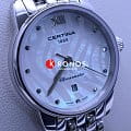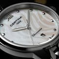 Перламутровый циферблат с привлекательным узором дарует эстетическое наслаждение. Стальной браслет из нескольких рядов переплетающихся звеньев элегантно выглядит на запястье. Часы отмечены официальным сертификатом хронометра COSCСертификат COSCОфициальный сертификат, подтверждающий то, что часы ходят с особо высокой точностью. Для получения документа часы подвергаются тестовым испытаниям, разработанным швейцарским институтом тестирования хронометров COSC. Допустимая норма для механических часов -4/+6 секунд в день, для кварцевых моделей +/- 0,07 секунд в день., ведь в основе работы находится швейцарский кварцевый механизм ETA G10.962 Precidrive™Precidrive™Инновационный кварцевый механизм Certina. Часы, оснащённые этим швейцарским калибром, приравниваются к точности к сертифицированным хронометрам, точность хода составляет +/-10 секунд в год.. Ударопрочность и водонепроницаемость 10 бар – концепция DS ConceptDS ConceptDouble Security Concept, обозначает двойную надёжность и безупречную точность часов Certina. Двойная система защиты подразумевает обеспечение максимальной устойчивости к ударам и высоких показателей водонепроницаемости.. Одностороннее антибликовое покрытие стекла из сапфира. . Индикация текущего числа, функция EOLEOLПредставляет собой систему, уведомляющую владельца часов о необходимости замены элемента питания. За 2 недели до полного разряда батарейки секундная стрелка перестаёт ходить чётко и начинает перепрыгивать на 3-4 деления.. Диаметр корпуса: 27,5 мм.