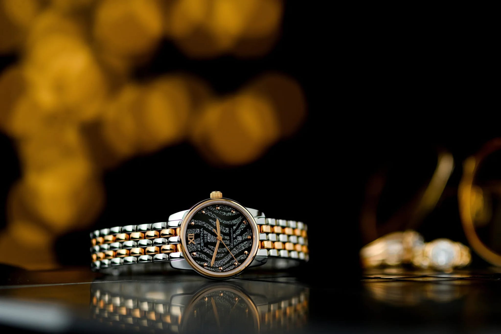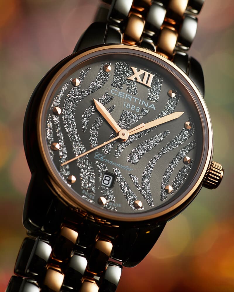 Изысканный аксессуар – лучший вариант для делового костюма или вечернего наряда. Эффектный циферблат дополнен незатейливым узором и золотистой часовой разметкой. Часы привлекают не только дизайном, но и абсолютной точностью: швейцарский кварцевый механизм ETA G10.962 Precidrive™Precidrive™Инновационный кварцевый механизм Certina. Часы, оснащённые этим швейцарским калибром, приравниваются к точности к сертифицированным хронометрам, точность хода составляет +/-10 секунд в год. удостоился официального сертификата COSCСертификат COSCОфициальный сертификат, подтверждающий то, что часы ходят с особо высокой точностью. Для получения документа часы подвергаются тестовым испытаниям, разработанным швейцарским институтом тестирования хронометров COSC. Допустимая норма для механических часов -4/+6 секунд в день, для кварцевых моделей +/- 0,07 секунд в день.. Система DS ConceptDS ConceptDouble Security Concept, обозначает двойную надёжность и безупречную точность часов Certina. Двойная система защиты подразумевает обеспечение максимальной устойчивости к ударам и высоких показателей водонепроницаемости.. Противокоррозионная сталь 316L с PVD-покрытиемPVDУльтратонкое покрытие наносится в технике вакуумного напыления, сочетает в себе нитрид титана особой прочности со слоем золота или оксида хрома. Несёт в себе декоративную или защитную функцию.. Степень водозащиты WR 100. Стекло из сапфира с антибликовой обработкой. . Отображение числа, индикатор EOLEOLПредставляет собой систему, уведомляющую владельца часов о необходимости замены элемента питания. За 2 недели до полного разряда батарейки секундная стрелка перестаёт ходить чётко и начинает перепрыгивать на 3-4 деления.. Диаметр корпуса: 27,5 мм.