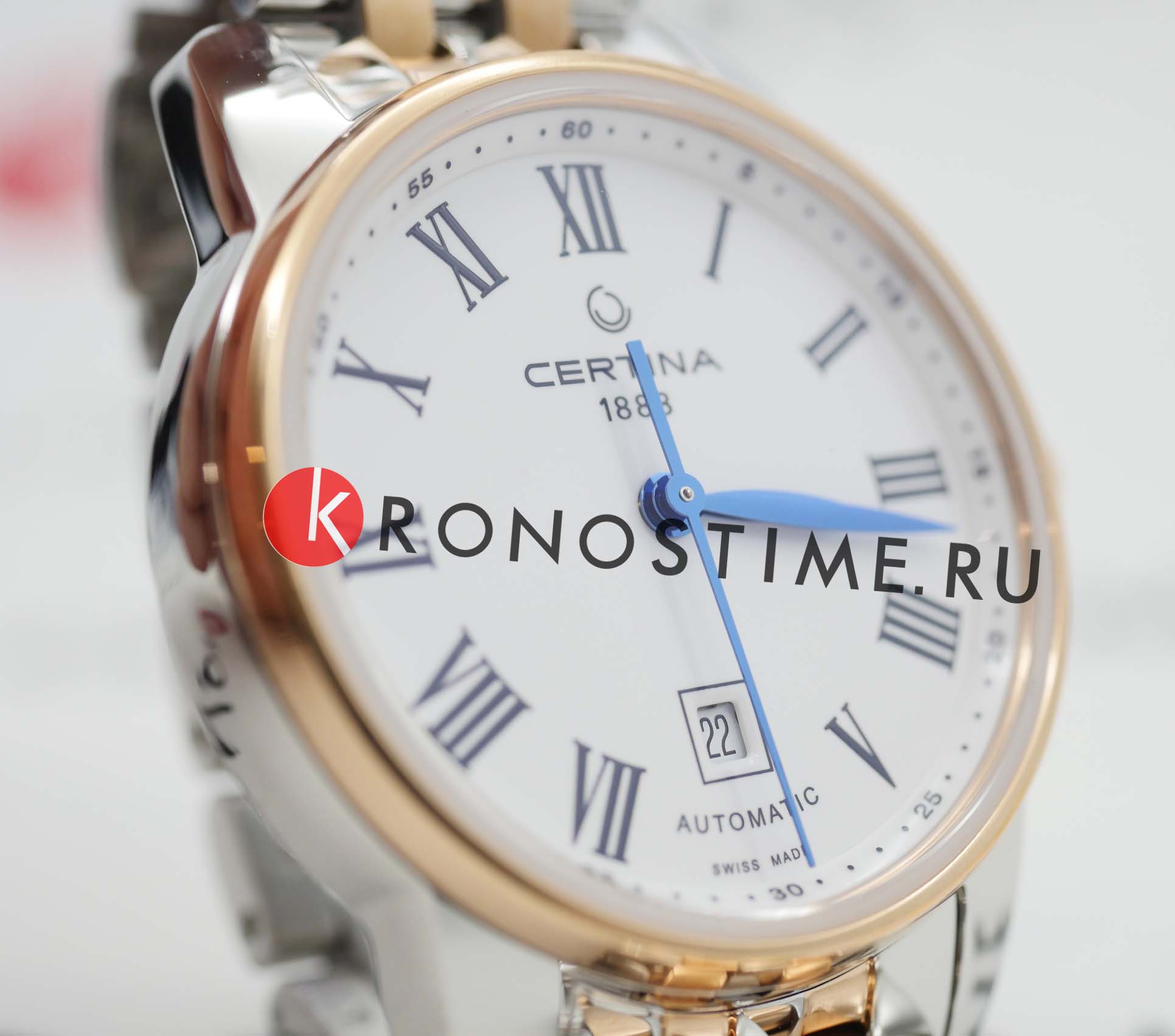 Элегантный аксессуар обладает вневременным дизайном, белый циферблат дополнен римскими цифрами с винтажным оттенком. Часы с автоматической системой завода для своей работы используют энергию от движений руки носительницы, позволяя забыть о необходимости регулярного завода. Швейцарский механизм ETA 2671 с 38-часовым запасом хода. Скелетонизированная задняя крышка. Сапфировое стеклоСапфировое стеклоПрочный и надёжный материал из кристалла сапфира синтетического происхождения, характеризующийся особой твёрдостью и устойчивостью к царапинам и повреждениям. с двухсторонней обработкой «антиблик». Концепция Double SecurityDS ConceptDouble Security Concept, обозначает двойную надёжность и безупречную точность часов Certina. Двойная система защиты подразумевает обеспечение максимальной устойчивости к ударам и высоких показателей водонепроницаемости.. Корпус и браслет из нержавеющей стали 316L с PVD-покрытиемPVDУльтратонкое покрытие наносится в технике вакуумного напыления, сочетает в себе нитрид титана особой прочности со слоем золота или оксида хрома. Несёт в себе декоративную или защитную функцию. «розовое золото». Водозащита 100 метров. Застёжка «бабочка» с кнопкамиЗастёжка "бабочка"Такой вид застёжки дополняется предохранителями, помогающими избежать случайного раскрытия браслета. Обладают изящным исполнением. . Отображение числа. Диаметр корпуса: 29 мм.