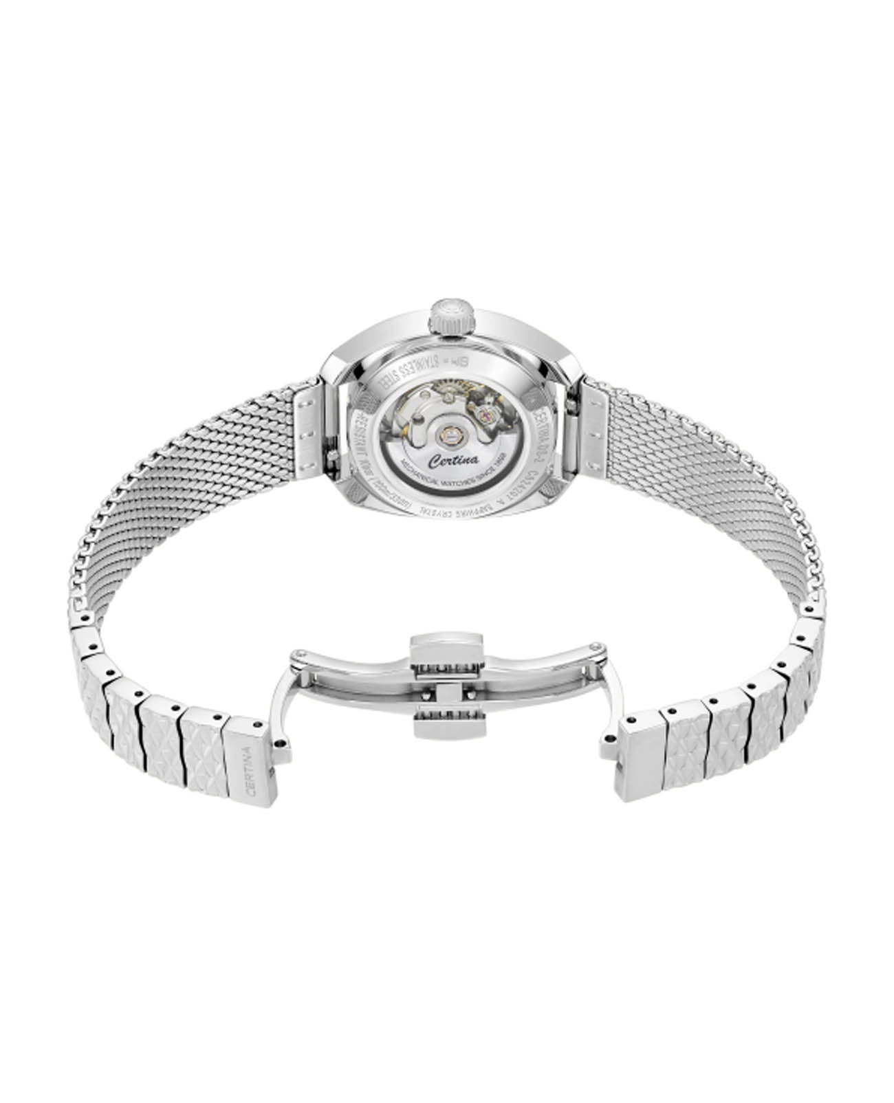 Женские швейцарские механические часы с автоподзаводом Certina DS-2 C0242071111100. Сапфировое стеклоСапфировое стеклоПрочный и надёжный материал из кристалла сапфира синтетического происхождения, характеризующийся особой твёрдостью и устойчивостью к царапинам и повреждениям. устойчивое к появлению царапин, обладающее высокой прозрачностью. Корпус изготовлен из нержавеющей стали. Стрелки с люминесцентным покрытиемЛюминесцентное покрытиеПозволяет считывать показания времени в темноте. Производители наносят на стрелки, часовые индексы, безель или поверхность циферблата светонакопительный состав, дающий холодное свечение. Superluminova. Окошко даты находится в положении 3 часа. Класс водозащиты: 100 метров, позволит плавать, нырять и заниматься другими водными видами спорта. Стальной браслет с частичным миланским плетением на застёжке-бабочке с кнопкамиЗастёжка "бабочка"Такой вид застёжки дополняется предохранителями, помогающими избежать случайного раскрытия браслета. Обладают изящным исполнением. .