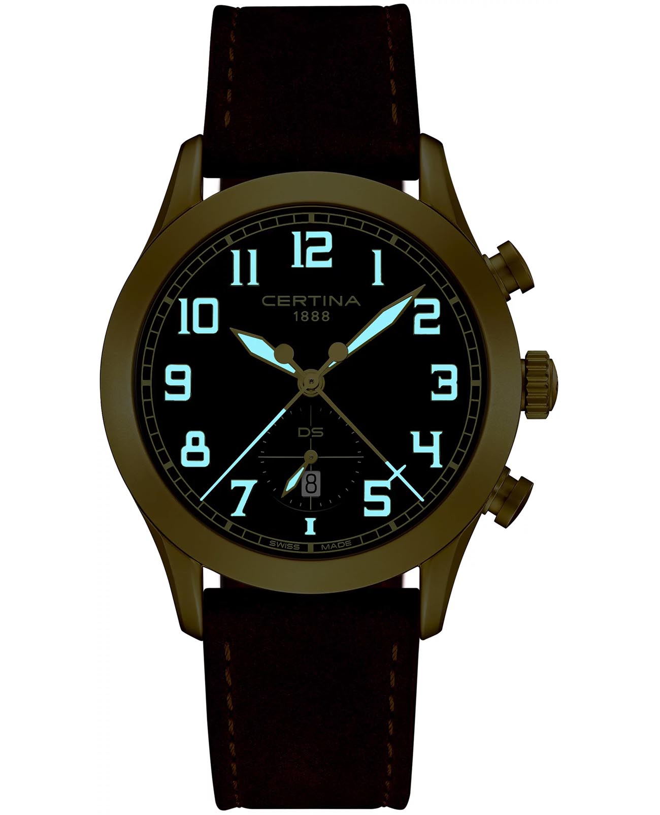 Мужские швейцарские часы Certina DS Pilot C0246173609200, кварцевый механизм с высокой точностью. Сапфировое стеклоСапфировое стеклоПрочный и надёжный материал из кристалла сапфира синтетического происхождения, характеризующийся особой твёрдостью и устойчивостью к царапинам и повреждениям. устойчивое к появлению царапин, обладающее высокой прозрачностью. Корпус изготовлен из нержавеющей стали с PVD-покрытиемPVDУльтратонкое покрытие наносится в технике вакуумного напыления, сочетает в себе нитрид титана особой прочности со слоем золота или оксида хрома. Несёт в себе декоративную или защитную функцию.. Стрелки с люминесцентным покрытиемЛюминесцентное покрытиеПозволяет считывать показания времени в темноте. Производители наносят на стрелки, часовые индексы, безель или поверхность циферблата светонакопительный состав, дающий холодное свечение.. Окошко даты находится в положении 6 часов. Класс водозащиты: 100 метров, позволит плавать, нырять и заниматься другими водными видами спорта. Кожаный браслет на стандартной застежке.