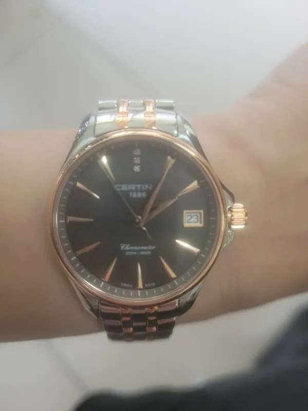 Аксессуар обладает изящным силуэтом, отражающим классический стиль и элегантность. Циферблат украшен 3 роскошными бриллиантами оттенка Top Wesselton. Часы комплектуются высокоточным кварцевым калибром F06.411 от швейцарской компании ETA, высокая точность механизма подтверждается сертификатом хронометра COSCСертификат COSCОфициальный сертификат, подтверждающий то, что часы ходят с особо высокой точностью. Для получения документа часы подвергаются тестовым испытаниям, разработанным швейцарским институтом тестирования хронометров COSC. Допустимая норма для механических часов -4/+6 секунд в день, для кварцевых моделей +/- 0,07 секунд в день.. Концепция DS ConceptDS ConceptDouble Security Concept, обозначает двойную надёжность и безупречную точность часов Certina. Двойная система защиты подразумевает обеспечение максимальной устойчивости к ударам и высоких показателей водонепроницаемости. гарантирует повышенную ударопрочность часов и сохранение водонепроницаемости до 20 бар. Одностороннее антибликовое покрытие сапфирового стекла.Корпус и браслет из хирургической стали 316L. PVD-покрытиеPVDУльтратонкое покрытие наносится в технике вакуумного напыления, сочетает в себе нитрид титана особой прочности со слоем золота или оксида хрома. Несёт в себе декоративную или защитную функцию. цвета розового золота. . Окошко даты, функция EOLEOLПредставляет собой систему, уведомляющую владельца часов о необходимости замены элемента питания. За 2 недели до полного разряда батарейки секундная стрелка перестаёт ходить чётко и начинает перепрыгивать на 3-4 деления.. Диаметр корпуса: 33,8 мм.