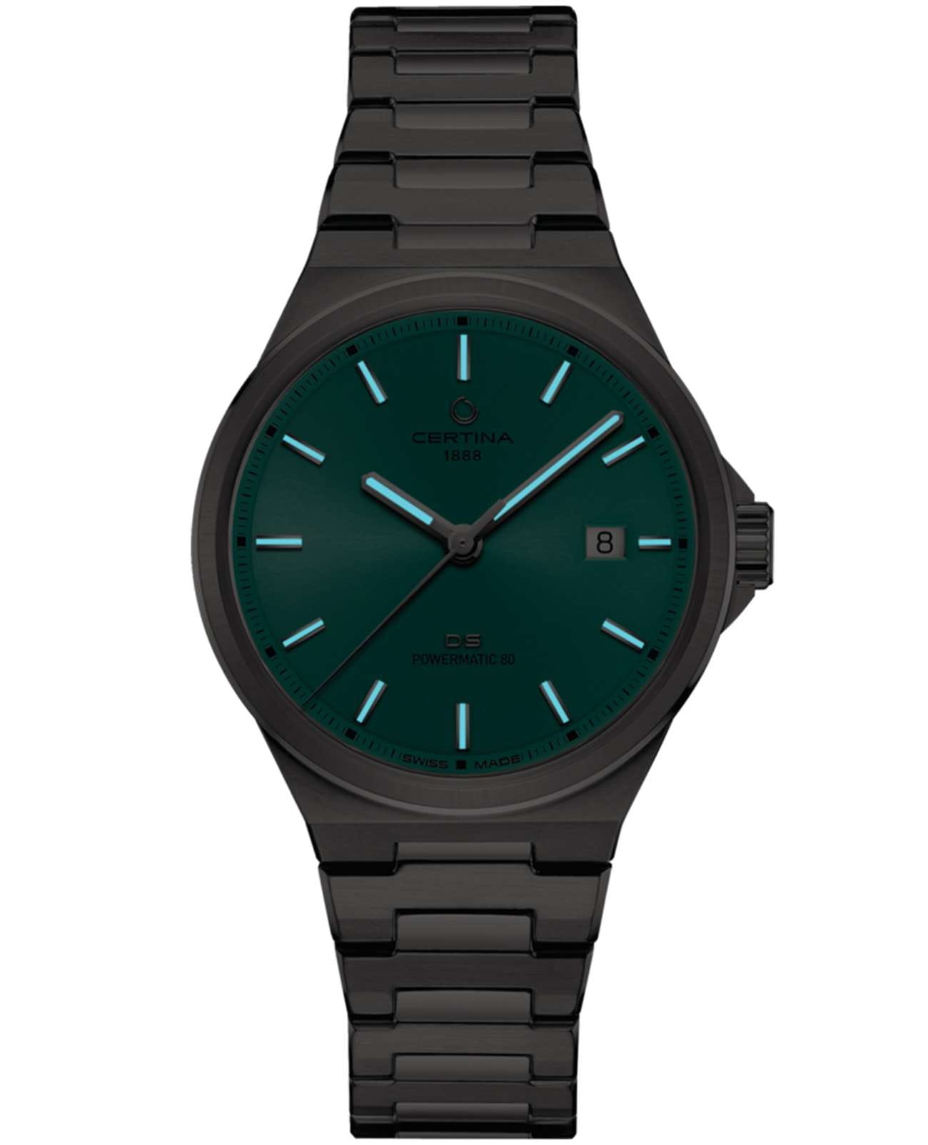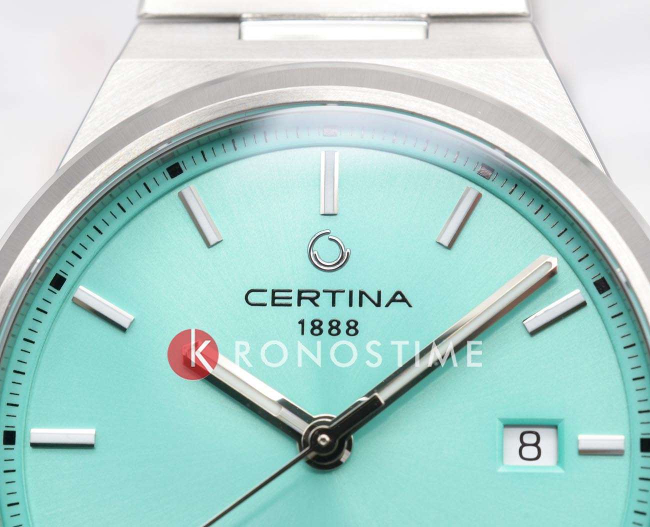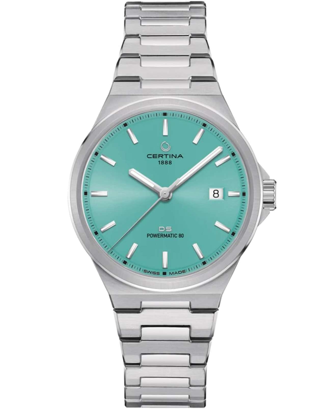Certina DS-7 Powermatic 80 C043.407.11.351.00 – часы для поклонников ярких аксессуаров. И корпус, и браслет изготовлены из высококачественной нержавеющей стали 316L с . Под твердым сапфировым стекломСапфировое стеклоПрочный и надёжный материал из кристалла сапфира синтетического происхождения, характеризующийся особой твёрдостью и устойчивостью к царапинам и повреждениям. с антибликовым покрытиемАнтибликовое покрытиеСлой оксида металла в 0,13-0,3 микрон, благодаря которому стекло часов не бликует и не отражает свет. Антибликовое покрытие уменьшает отражение света в 10 раз, обеспечивая отличную читаемость показателей циферблата. находится бирюзовый циферблат и на котором вы найдете окошко даты в положении 3 часа, а также маркировку, покрытую люминесцентным покрытиемЛюминесцентное покрытиеПозволяет считывать показания времени в темноте. Производители наносят на стрелки, часовые индексы, безель или поверхность циферблата светонакопительный состав, дающий холодное свечение. Super-LumiNova.   Все это приводится в действие автоматическим механизмом Powermatic 80Powermatic 80Эксклюзивный калибр от швейцарской компании ETA с увеличенным запасом хода до 80 часов за счёт удлинённой заводной пружины. Характеризуется улучшенной системой спуска со сниженным трением..611 с пружиной Nivachron™Nivachron™Специально разработанный инновационный сплав Nivachron™ повышает устойчивость часов к воздействию магнитных полей.. Класс водозащиты: 100 метров, позволит плавать, нырять и заниматься другими водными видами спорта. Стальной браслет на застёжке-бабочке с кнопкамиЗастёжка "бабочка"Такой вид застёжки дополняется предохранителями, помогающими избежать случайного раскрытия браслета. Обладают изящным исполнением. .