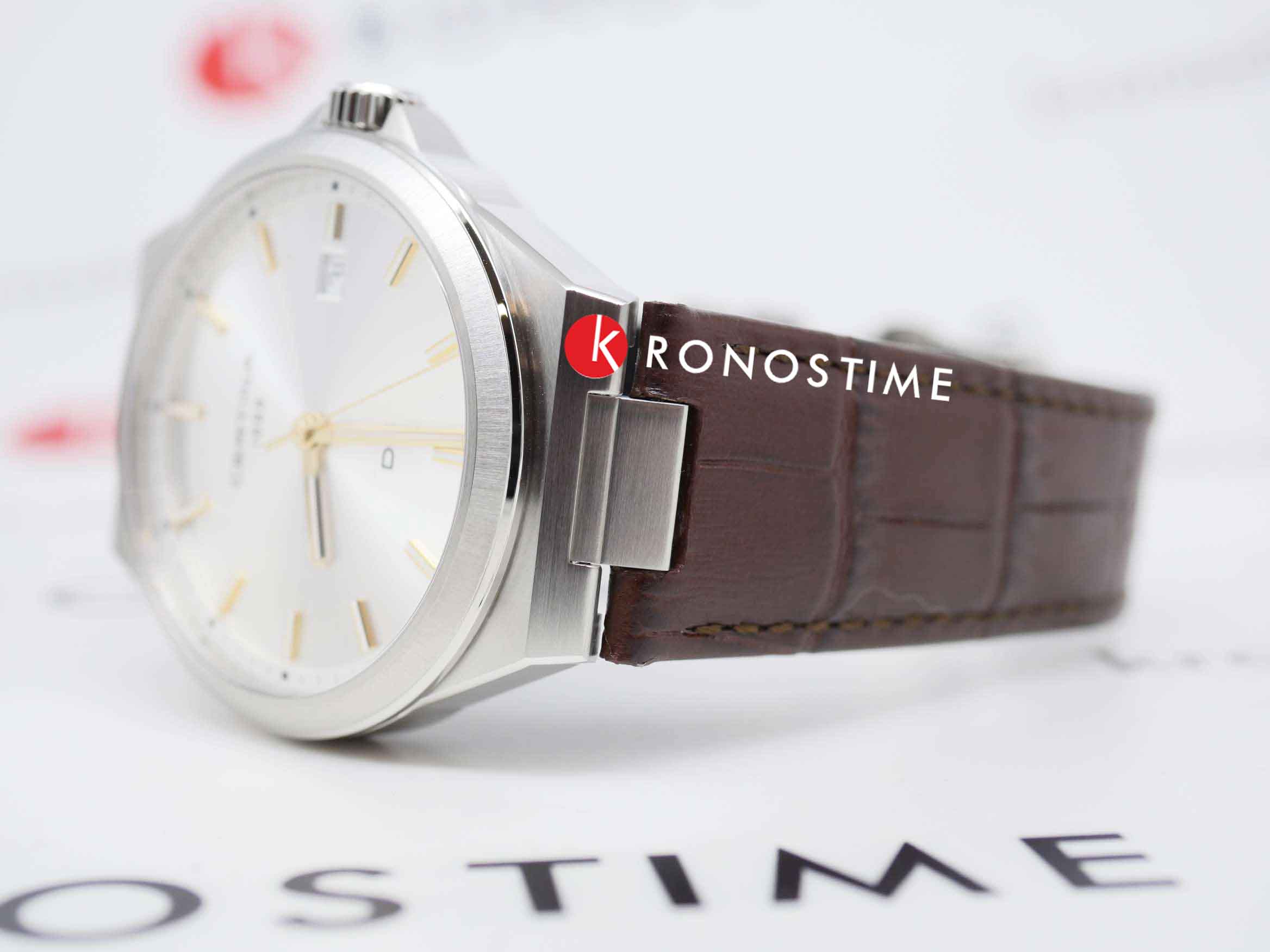 Серебристый циферблат дополнен люминесцентными стрелками и метками с покрытием Super-LumiNova®, что гарантирует отличную видимость в условиях низкой освещённости. Окошко даты на отметке «3 часа» добавляет удобства.