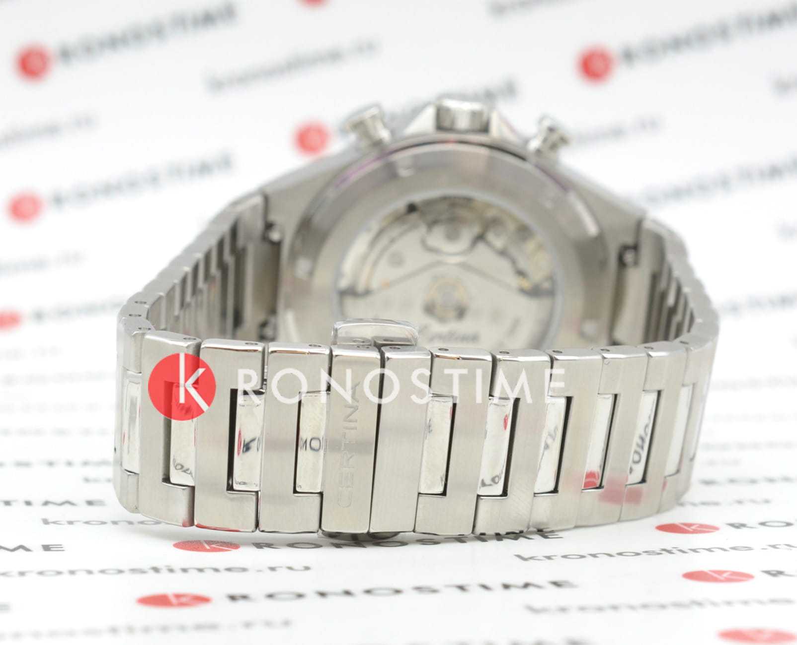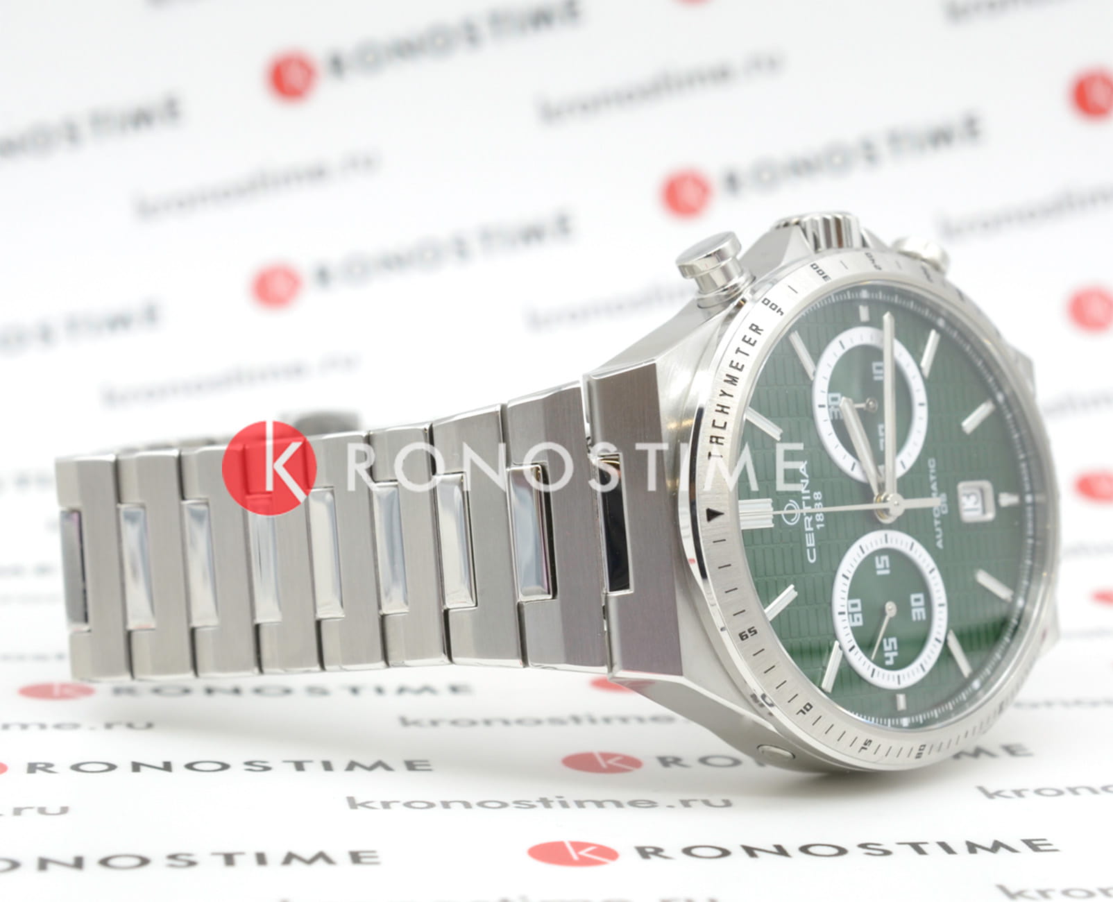 Мужские часы-хронографХронографФункция позволяет измерять отрезки времени с особой точностью: часы, минуты, секунды. Верным признаком хронографа является наличие на циферблате 3 дополнительных окошек-счётчиков. Certina DS-7 Chrono Auto C043.427.11.091.00. Корпус часов изготовлен из нержавеющей стали 316L. Под твердым сапфировым стекломСапфировое стеклоПрочный и надёжный материал из кристалла сапфира синтетического происхождения, характеризующийся особой твёрдостью и устойчивостью к царапинам и повреждениям. с антибликовым покрытиемАнтибликовое покрытиеСлой оксида металла в 0,13-0,3 микрон, благодаря которому стекло часов не бликует и не отражает свет. Антибликовое покрытие уменьшает отражение света в 10 раз, обеспечивая отличную читаемость показателей циферблата. Окошко даты в положении 6 часа, а также маркировку, покрытую люминесцентным покрытиемЛюминесцентное покрытиеПозволяет считывать показания времени в темноте. Производители наносят на стрелки, часовые индексы, безель или поверхность циферблата светонакопительный состав, дающий холодное свечение. Super-LumiNova. Класс водозащиты: 100 метров, позволит плавать, нырять и заниматься другими водными видами спорта. Стальной браслет на застёжке-бабочке с кнопкамиЗастёжка "бабочка"Такой вид застёжки дополняется предохранителями, помогающими избежать случайного раскрытия браслета. Обладают изящным исполнением. .ТахиметрТахиметрРазмеченная шкала, располагается на ободке или безеле часов. Тахиметр позволяет рассчитать скорость на определённом участке пути, расстояние измеряется в километрах или милях..