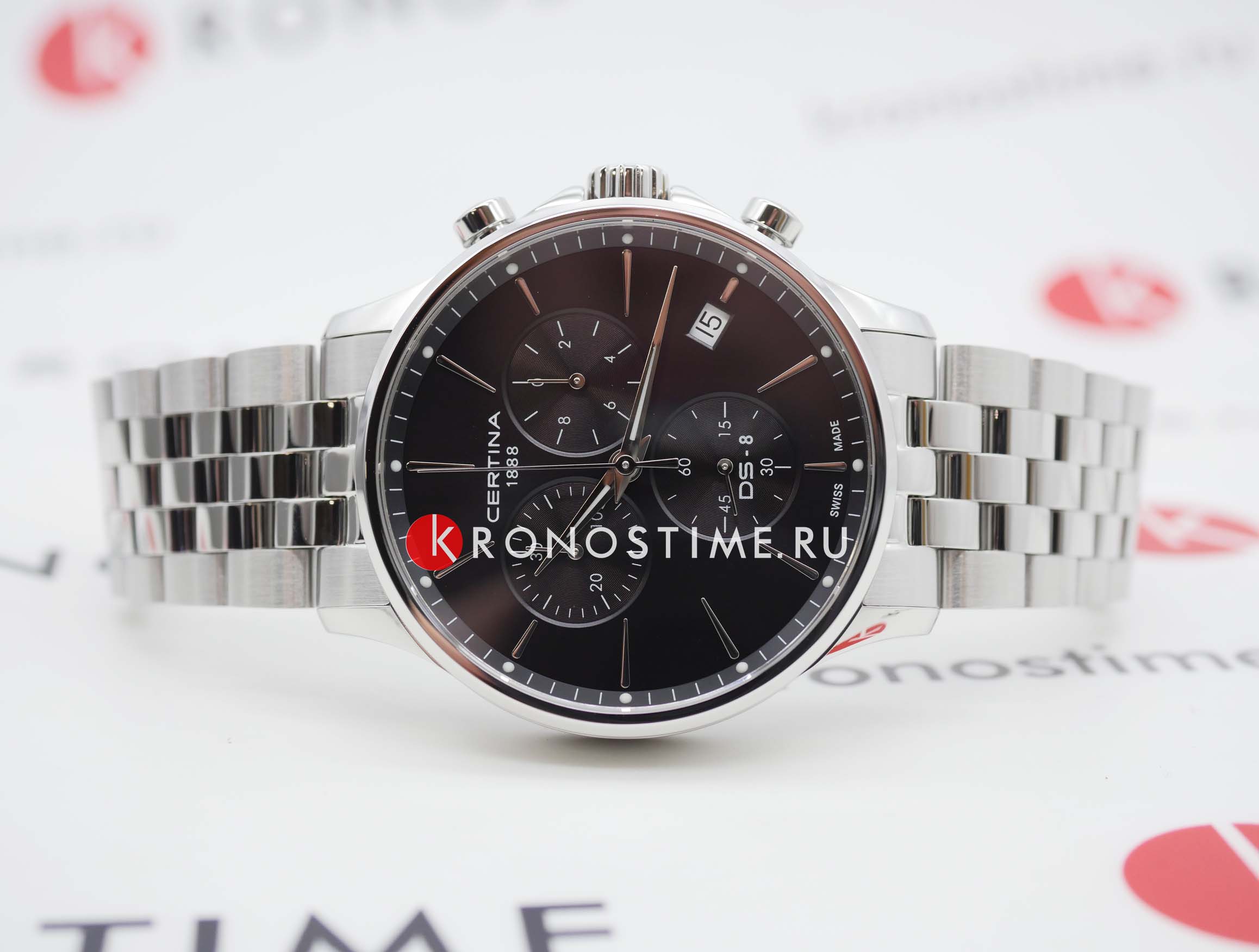 Высокая точность хода швейцарского кварцевого калибра ETA G15.212 AA Precidrive™Precidrive™Инновационный кварцевый механизм Certina. Часы, оснащённые этим швейцарским калибром, приравниваются к точности к сертифицированным хронометрам, точность хода составляет +/-10 секунд в год. отмечена сертификатом COSCСертификат COSCОфициальный сертификат, подтверждающий то, что часы ходят с особо высокой точностью. Для получения документа часы подвергаются тестовым испытаниям, разработанным швейцарским институтом тестирования хронометров COSC. Допустимая норма для механических часов -4/+6 секунд в день, для кварцевых моделей +/- 0,07 секунд в день.. Сапфировое стеклоСапфировое стеклоПрочный и надёжный материал из кристалла сапфира синтетического происхождения, характеризующийся особой твёрдостью и устойчивостью к царапинам и повреждениям. с покрытием «антиблик». ХронографХронографФункция позволяет измерять отрезки времени с особой точностью: часы, минуты, секунды. Верным признаком хронографа является наличие на циферблате 3 дополнительных окошек-счётчиков., секундомер, дата, EOLEOLПредставляет собой систему, уведомляющую владельца часов о необходимости замены элемента питания. За 2 недели до полного разряда батарейки секундная стрелка перестаёт ходить чётко и начинает перепрыгивать на 3-4 деления.. Концепция Двойной Надёжности DSDS ConceptDouble Security Concept, обозначает двойную надёжность и безупречную точность часов Certina. Двойная система защиты подразумевает обеспечение максимальной устойчивости к ударам и высоких показателей водонепроницаемости.. Стальной браслет на застёжке-бабочке с кнопкамиЗастёжка "бабочка"Такой вид застёжки дополняется предохранителями, помогающими избежать случайного раскрытия браслета. Обладают изящным исполнением. .