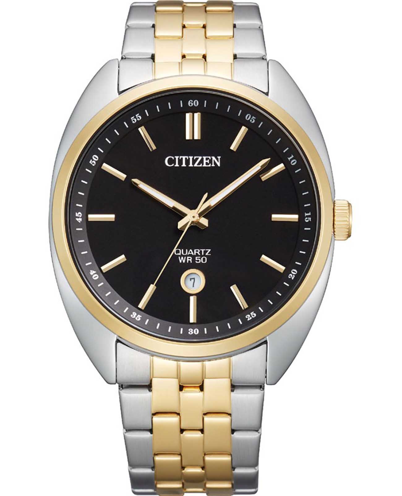 Часы Citizen BI5094-59E — это стильная и надежная модель японского производства, оснащённая высокоточным кварцевым механизмом Citizen G111. Круглый корпус диаметром 42 мм выполнен из нержавеющей стали, что придаёт изделию элегантный и современный вид, а также защищает от внешних воздействий. БезельБезельВнешний ободок, закрепляющий стекло. В спортивных часах так называется поворотное кольцо с делениями на циферблате, выполняет роль таймера – замеряет отрезки времени на шкале. Неподвижный безель – элемент декора. Однонаправленно вращающийся безель на дайверских часах позволяет фиксировать моменты погружения и выныривания на поверхность. с элегантным золотистым IP-покрытиемIP-покрытиеМетод ионного напыления. Демонстрирует повышенную устойчивость к истиранию, окислению и химическим веществам. Под воздействием высокого давления и температуры около 1500°C молекулы металла надёжно соединяются с частицами корпуса часов.. Черный циферблат оформлен минималистично, с метками в виде аккуратных штрихов и заострёнными прямоугольными стрелками в стиле Baton с люминесцентным покрытиемЛюминесцентное покрытиеПозволяет считывать показания времени в темноте. Производители наносят на стрелки, часовые индексы, безель или поверхность циферблата светонакопительный состав, дающий холодное свечение. для удобного считывания времени даже в темноте. Минеральное стеклоМинеральное стеклоМинеральное стекло представляет собой искусственно выращенный минерал кварца. Такое стекло отличается особой устойчивостью к повреждениям и царапинам. Уступает по некоторым качествам сапфировому стеклу. гарантирует защиту от царапин и сохраняет презентабельный внешний вид на долгое время. Окошко календаря с отображением числа расположено в позиции 6 часов, что добавляет функциональности и подчеркивает современный стиль модели. Рифленая заводная головка обеспечивает лёгкость настройки, а стальной браслет с частичным золотистым IP-покрытиемIP-покрытиеМетод ионного напыления. Демонстрирует повышенную устойчивость к истиранию, окислению и химическим веществам. Под воздействием высокого давления и температуры около 1500°C молекулы металла надёжно соединяются с частицами корпуса часов. и раскладывающейся застёжкой надёжно фиксирует часы на запястье. Водозащита до 50 метров позволяет не опасаться случайного контакта с водой в повседневной жизни.