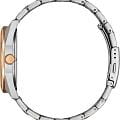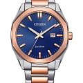 Citizen BM7606-84L — элегантные японские часы с современным кварцевым механизмом Citizen E111 и инновационной системой Eco-Drive, которая работает от солнечной энергии и не требует замены батарейки, обеспечивая автономную работу до 180 дней. Корпус и браслет выполнены из нержавеющей стали, а на безельБезельВнешний ободок, закрепляющий стекло. В спортивных часах так называется поворотное кольцо с делениями на циферблате, выполняет роль таймера – замеряет отрезки времени на шкале. Неподвижный безель – элемент декора. Однонаправленно вращающийся безель на дайверских часах позволяет фиксировать моменты погружения и выныривания на поверхность. с браслетом частично нанесено розово-золотистое IP-покрытиеIP-покрытиеМетод ионного напыления. Демонстрирует повышенную устойчивость к истиранию, окислению и химическим веществам. Под воздействием высокого давления и температуры около 1500°C молекулы металла надёжно соединяются с частицами корпуса часов., что придает часам стильный и износостойкий внешний вид. Синий циферблат с изящным эффектом Sunray украшен минималистичными часовыми метками в виде штрихов и дополнен окошком даты на позиции 3 часа для удобства контроля времени. Стрелки с люминесцентным покрытиемЛюминесцентное покрытиеПозволяет считывать показания времени в темноте. Производители наносят на стрелки, часовые индексы, безель или поверхность циферблата светонакопительный состав, дающий холодное свечение. обеспечивают отличную читаемость времени даже в темное время суток. Прочное минеральное стеклоМинеральное стеклоМинеральное стекло представляет собой искусственно выращенный минерал кварца. Такое стекло отличается особой устойчивостью к повреждениям и царапинам. Уступает по некоторым качествам сапфировому стеклу. надежно защищает циферблат от случайных повреждений. Водозащита 100WR позволяет использовать часы во время плавания и занятий спортом без риска повреждения. Диаметр корпуса составляет 41 мм, толщина — 9,7 мм, вес — 125 грамм, что делает модель удобной для ежедневного ношения. Браслет оснащен надежной раскладной застёжкойРаскладная застёжкаТакой тип застёжки используется только на браслетах из металла. Она никогда не раскрывается полностью, происходит разделение на 2 и более частей. Раскладывающая застёжка снизит вероятность потери часов к минимуму. для максимального комфорта. Функции индикации заряда EOLEOLПредставляет собой систему, уведомляющую владельца часов о необходимости замены элемента питания. За 2 недели до полного разряда батарейки секундная стрелка перестаёт ходить чётко и начинает перепрыгивать на 3-4 деления. и предотвращения перезарядки делают эксплуатацию часов простой и безопасной.