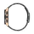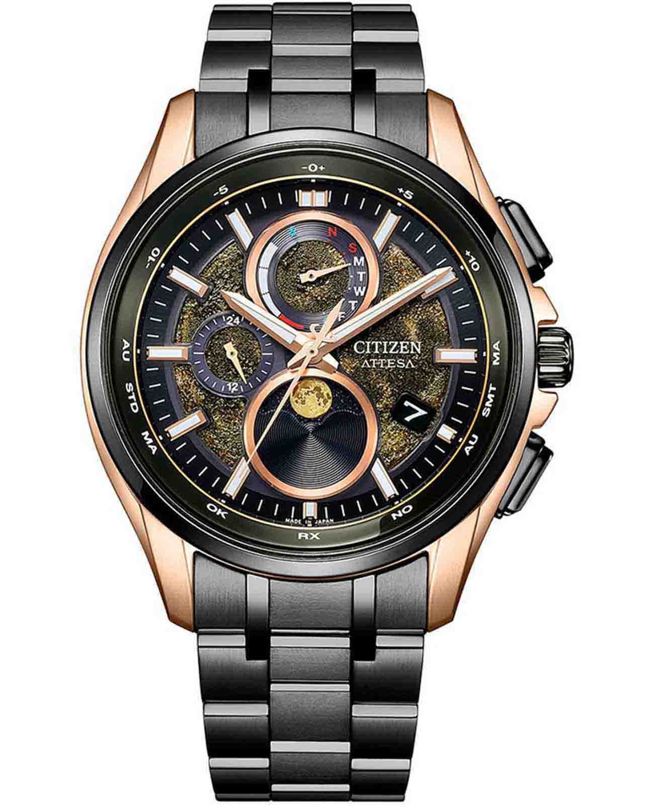 Часы Citizen BY1009-64Y — это гармоничное сочетание современного японского стиля, передовых технологий и высокого уровня надежности. Модель выполнена в прочном и легком корпусе из инновационного суперлегкого титана Super Titanium Duratect TIC с золотистым DLC-покрытиемDLC-покрытиеDiamond like carbon - одно из лучших видов покрытия, представляющее собой углерод с алмазными свойствами. На поверхность материала наносятся распавшиеся молекулы углерода, превращающиеся в плёнку из алмазоподобных связей, которая перенимает твёрдость алмаза. диаметром 41,5 мм и толщиной 10,8 мм, дополненном браслетом шириной 22 мм с удобной раскладной застёжкойРаскладная застёжкаТакой тип застёжки используется только на браслетах из металла. Она никогда не раскрывается полностью, происходит разделение на 2 и более частей. Раскладывающая застёжка снизит вероятность потери часов к минимуму.. БезельБезельВнешний ободок, закрепляющий стекло. В спортивных часах так называется поворотное кольцо с делениями на циферблате, выполняет роль таймера – замеряет отрезки времени на шкале. Неподвижный безель – элемент декора. Однонаправленно вращающийся безель на дайверских часах позволяет фиксировать моменты погружения и выныривания на поверхность. и браслет с элегантным черным DLC-покрытиемDLC-покрытиеDiamond like carbon - одно из лучших видов покрытия, представляющее собой углерод с алмазными свойствами. На поверхность материала наносятся распавшиеся молекулы углерода, превращающиеся в плёнку из алмазоподобных связей, которая перенимает твёрдость алмаза. Кварцевый механизм калибра Citizen H874 оснащен системой Eco-Drive, которая работает на солнечной энергии, не требуя замены батарейки, и обеспечивает запас хода до 180 дней. Часы отличаются высокой точностью хода — отклонение составляет всего +/- 15 секунд в месяц. Среди функциональных особенностей — автоматическая настройка времени по радиосигналу для Германии, Японии, США и Китая, вечный календарь, функция мирового времениМировое время Полезное часовое усложнение, отображающее время в основных городах и известных областях по всему миру, оно связано с часовыми поясами, удобно для путешественников и бизнесменов. , 12/24-часовой формат, автоматическое переключение летнего и зимнего времени, а также уникальный полностью автоматизированный радиоуправляемый механизм определения фаз Луны с возможностью отображения как для северного, так и южного полушария. На черном циферблате расположена апертура даты в положении 4 часа, все стрелки с люминесцентным покрытиемЛюминесцентное покрытиеПозволяет считывать показания времени в темноте. Производители наносят на стрелки, часовые индексы, безель или поверхность циферблата светонакопительный состав, дающий холодное свечение. для отличной читаемости в любое время суток. Устойчивое к царапинам сапфировое стеклоСапфировое стеклоПрочный и надёжный материал из кристалла сапфира синтетического происхождения, характеризующийся особой твёрдостью и устойчивостью к царапинам и повреждениям. с антибликовым покрытиемАнтибликовое покрытиеСлой оксида металла в 0,13-0,3 микрон, благодаря которому стекло часов не бликует и не отражает свет. Антибликовое покрытие уменьшает отражение света в 10 раз, обеспечивая отличную читаемость показателей циферблата. надежно защищает циферблат. Водозащита уровня WR 100 позволяет