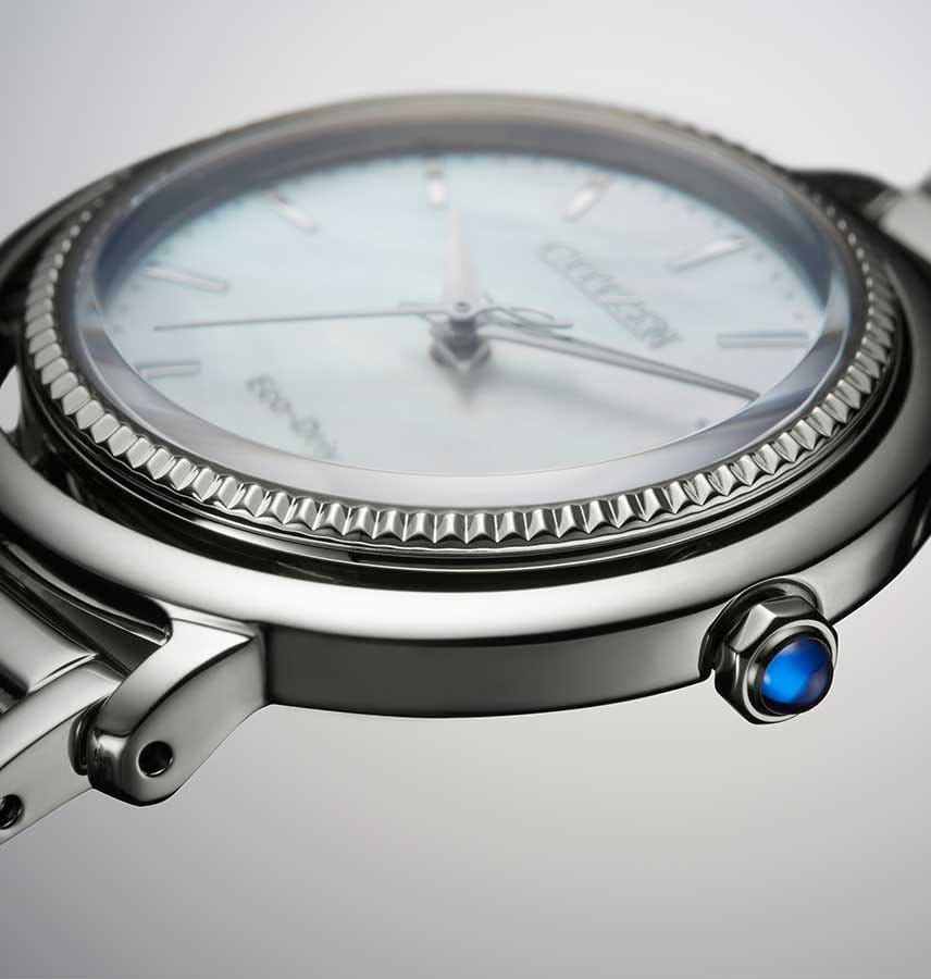 Элегантные часы Citizen EM1100-84D произведены в Японии и оснащены современным кварцевым механизмом Citizen E031 с инновационной системой Eco-Drive, которая использует энергию солнечного света и не требует замены батарейки, обеспечивая до 180 дней работы в автономном режиме. Корпус и браслет выполнены из высококачественной нержавеющей стали, что гарантирует долговечность и износостойкость. Перламутровый голубой циферблат с изящными штриховыми метками защищён выпуклым сапфировым стекломСапфировое стеклоПрочный и надёжный материал из кристалла сапфира синтетического происхождения, характеризующийся особой твёрдостью и устойчивостью к царапинам и повреждениям., устойчивым к царапинам. БезельБезельВнешний ободок, закрепляющий стекло. В спортивных часах так называется поворотное кольцо с делениями на циферблате, выполняет роль таймера – замеряет отрезки времени на шкале. Неподвижный безель – элемент декора. Однонаправленно вращающийся безель на дайверских часах позволяет фиксировать моменты погружения и выныривания на поверхность. часов декорирован алмазной гранью, а заводная головка украшена камнем в форме кабошона, что придаёт модели особый шарм. Задняя крышка закреплена на четырёх винтах, что повышает надёжность конструкции. Часы имеют водозащиту до 50 метров, а также функцию индикации заряда и предотвращения перезарядки. Размер корпуса составляет 31,2 мм в диаметре и 8 мм в толщину, вес — 71 грамм. Застежка «бабочка»Застёжка "бабочка"Такой вид застёжки дополняется предохранителями, помогающими избежать случайного раскрытия браслета. Обладают изящным исполнением. у браслета обеспечивает комфортное и надёжное ношение. Эта модель идеально подчеркнёт изысканный стиль и индивидуальность своей обладательницы.