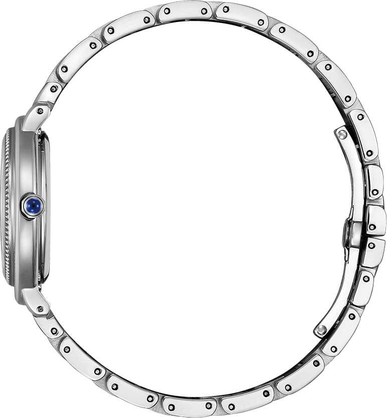 Элегантные часы Citizen EM1100-84H произведены в Японии и оснащены современным кварцевым механизмом Citizen E031 с инновационной системой Eco-Drive, которая использует энергию солнечного света и не требует замены батарейки, обеспечивая до 180 дней работы в автономном режиме. Корпус и браслет выполнены из высококачественной нержавеющей стали, что гарантирует долговечность и износостойкость. Перламутровый черный циферблат с изящными штриховыми метками защищён выпуклым сапфировым стекломСапфировое стеклоПрочный и надёжный материал из кристалла сапфира синтетического происхождения, характеризующийся особой твёрдостью и устойчивостью к царапинам и повреждениям., устойчивым к царапинам. БезельБезельВнешний ободок, закрепляющий стекло. В спортивных часах так называется поворотное кольцо с делениями на циферблате, выполняет роль таймера – замеряет отрезки времени на шкале. Неподвижный безель – элемент декора. Однонаправленно вращающийся безель на дайверских часах позволяет фиксировать моменты погружения и выныривания на поверхность. часов декорирован алмазной гранью, а заводная головка украшена камнем в форме кабошона, что придаёт модели особый шарм. Задняя крышка закреплена на четырёх винтах, что повышает надёжность конструкции. Часы имеют водозащиту до 50 метров, а также функцию индикации заряда и предотвращения перезарядки. Размер корпуса составляет 31,2 мм в диаметре и 8 мм в толщину, вес — 71 грамм. Застежка «бабочка»Застёжка "бабочка"Такой вид застёжки дополняется предохранителями, помогающими избежать случайного раскрытия браслета. Обладают изящным исполнением. у браслета обеспечивает комфортное и надёжное ношение. Эта модель идеально подчеркнёт изысканный стиль и индивидуальность своей обладательницы.