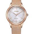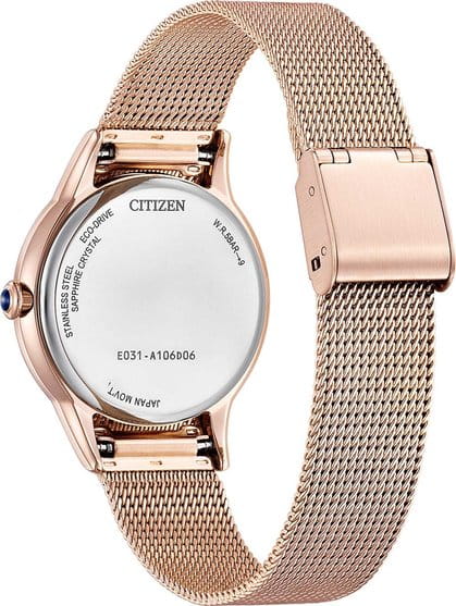 Часы Citizen EM1153-88A созданы для ценителей современного стиля и утончённой элегантности. Модель выполнена в Японии и оснащена кварцевым механизмом Citizen E031 с инновационной системой Eco-Drive, которая работает на солнечной энергии и не требует замены батарейки, обеспечивая до 180 дней автономной работы. Серебристый циферблат завораживает своими изысканными переливами, а изящные метки в виде штрихов и точек придают аксессуару лёгкость и гармонию. Сапфировое стеклоСапфировое стеклоПрочный и надёжный материал из кристалла сапфира синтетического происхождения, характеризующийся особой твёрдостью и устойчивостью к царапинам и повреждениям. надёжно защищает циферблат от царапин и повреждений. Корпус диаметром 32,5 мм и толщиной 7,6 мм изготовлен из нержавеющей стали с золотистым IP-покрытиемIP-покрытиеМетод ионного напыления. Демонстрирует повышенную устойчивость к истиранию, окислению и химическим веществам. Под воздействием высокого давления и температуры около 1500°C молекулы металла надёжно соединяются с частицами корпуса часов., вес изделия составляет всего 45 граммов, что обеспечивает комфортное ношение в течение всего дня. Заводная головка украшена камнем в форме кабошона, добавляя изысканный акцент. Стальной браслет миланского плетения с золотистым IP-покрытиемIP-покрытиеМетод ионного напыления. Демонстрирует повышенную устойчивость к истиранию, окислению и химическим веществам. Под воздействием высокого давления и температуры около 1500°C молекулы металла надёжно соединяются с частицами корпуса часов. и c раскладным замкомРаскладной замокДанный вариант застежки используется только на часах с металлическим браслетом. Отличительная особенность такого крепления в том, что длина браслета становится универсальной и вы можете самостоятельно отрегулировать нужный вам размер – застежка просто двигается по браслету часов. удобно фиксируется на запястье и подчёркивает современный характер часов. Водозащита 50WR позволяет не беспокоиться о случайном попадании влаги. Эта модель станет стильным дополнением к вашему образу и подчеркнёт вашу индивидуальность.