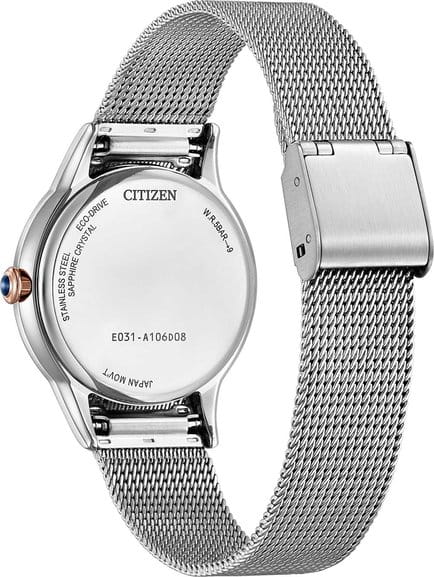 Часы Citizen EM1156-80X созданы для ценителей современного стиля и утончённой элегантности. Модель выполнена в Японии и оснащена кварцевым механизмом Citizen E031 с инновационной системой Eco-Drive, которая работает на солнечной энергии и не требует замены батарейки, обеспечивая до 180 дней автономной работы. Золотистый циферблат завораживает своими изысканными переливами, а изящные метки в виде штрихов и точек придают аксессуару лёгкость и гармонию. Сапфировое стеклоСапфировое стеклоПрочный и надёжный материал из кристалла сапфира синтетического происхождения, характеризующийся особой твёрдостью и устойчивостью к царапинам и повреждениям. надёжно защищает циферблат от царапин и повреждений. Корпус диаметром 32,5 мм и толщиной 7,6 мм изготовлен из нержавеющей стали, вес изделия составляет всего 45 граммов, что обеспечивает комфортное ношение в течение всего дня. БезельБезельВнешний ободок, закрепляющий стекло. В спортивных часах так называется поворотное кольцо с делениями на циферблате, выполняет роль таймера – замеряет отрезки времени на шкале. Неподвижный безель – элемент декора. Однонаправленно вращающийся безель на дайверских часах позволяет фиксировать моменты погружения и выныривания на поверхность. часов отличается золотистым IP-покрытиемIP-покрытиеМетод ионного напыления. Демонстрирует повышенную устойчивость к истиранию, окислению и химическим веществам. Под воздействием высокого давления и температуры около 1500°C молекулы металла надёжно соединяются с частицами корпуса часов., что придаёт аксессуару особый шарм. Заводная головка украшена камнем в форме кабошона, добавляя изысканный акцент. Стальной браслет миланского плетения c раскладным замкомРаскладной замокДанный вариант застежки используется только на часах с металлическим браслетом. Отличительная особенность такого крепления в том, что длина браслета становится универсальной и вы можете самостоятельно отрегулировать нужный вам размер – застежка просто двигается по браслету часов. удобно фиксируется на запястье и подчёркивает современный характер часов. Водозащита 50WR позволяет не беспокоиться о случайном попадании влаги. Эта модель станет стильным дополнением к вашему образу и подчеркнёт вашу индивидуальность.