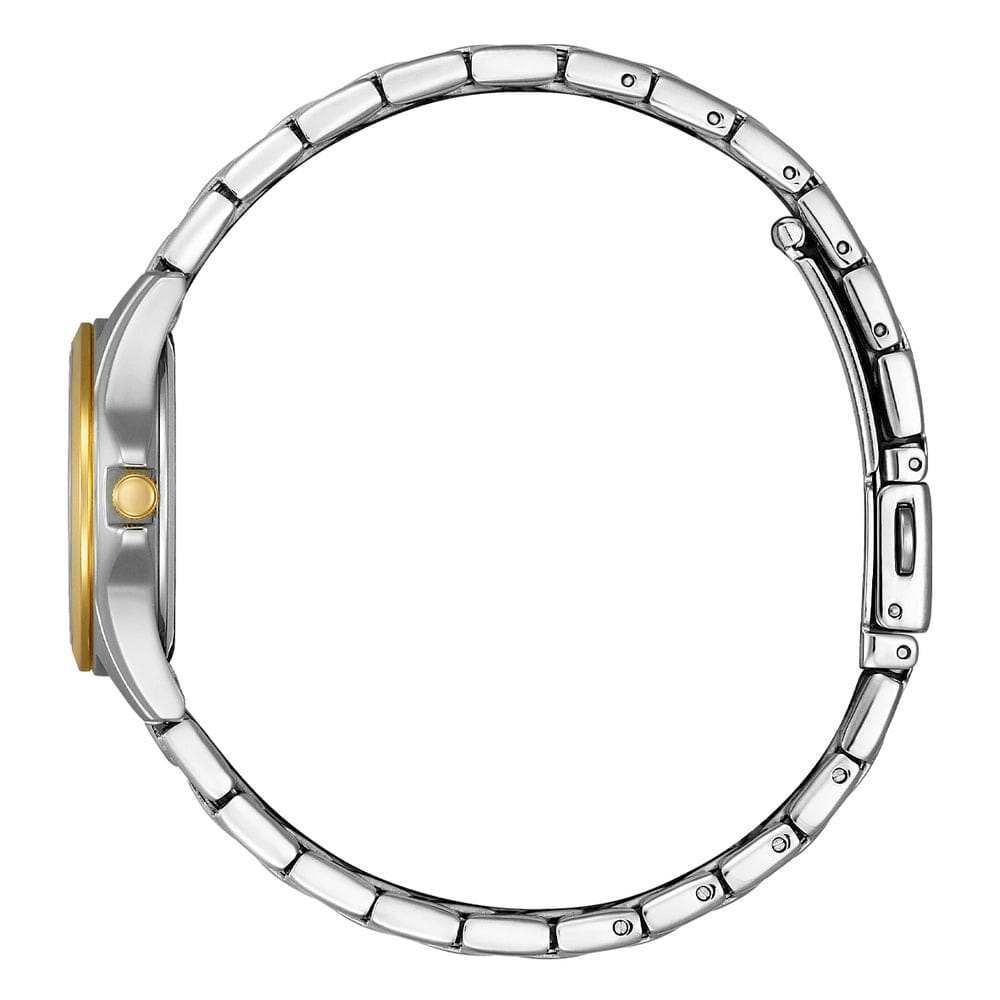 Часы Citizen EQ0614-52B — стильная модель для современных женщин, ценящих качество и элегантность. Корпус и браслет выполнены из прочной нержавеющей стали с изящным серебристым покрытием, а на безельБезельВнешний ободок, закрепляющий стекло. В спортивных часах так называется поворотное кольцо с делениями на циферблате, выполняет роль таймера – замеряет отрезки времени на шкале. Неподвижный безель – элемент декора. Однонаправленно вращающийся безель на дайверских часах позволяет фиксировать моменты погружения и выныривания на поверхность. и браслет (частично) нанесено золотистое IP-покрытиемIP-покрытиеМетод ионного напыления. Демонстрирует повышенную устойчивость к истиранию, окислению и химическим веществам. Под воздействием высокого давления и температуры около 1500°C молекулы металла надёжно соединяются с частицами корпуса часов., что придает аксессуару утончённый и универсальный внешний вид. Браслет оснащен раскладной застёжкойРаскладная застёжкаТакой тип застёжки используется только на браслетах из металла. Она никогда не раскрывается полностью, происходит разделение на 2 и более частей. Раскладывающая застёжка снизит вероятность потери часов к минимуму.. Серебристый циферблат украшен арабскими цифрами и серебристо-белыми стрелками с люминесцентным покрытиемЛюминесцентное покрытиеПозволяет считывать показания времени в темноте. Производители наносят на стрелки, часовые индексы, безель или поверхность циферблата светонакопительный состав, дающий холодное свечение., обеспечивая отличную читаемость времени, также он дополнен удобным календарем с окошком даты на позиции 3 часов. Модель оснащена надёжным кварцевым механизмом японского производства, отличается высокой точностью хода и минимальными требованиями к обслуживанию. Диаметр корпуса составляет 27.5 мм, толщина — всего 7 мм, что делает часы лёгкими и комфортными для ежедневного ношения. Минеральное стеклоМинеральное стеклоМинеральное стекло представляет собой искусственно выращенный минерал кварца. Такое стекло отличается особой устойчивостью к повреждениям и царапинам. Уступает по некоторым качествам сапфировому стеклу. защищает циферблат от случайных царапин, а водозащита уровня WR30 обеспечивает защиту от дождя и брызг.