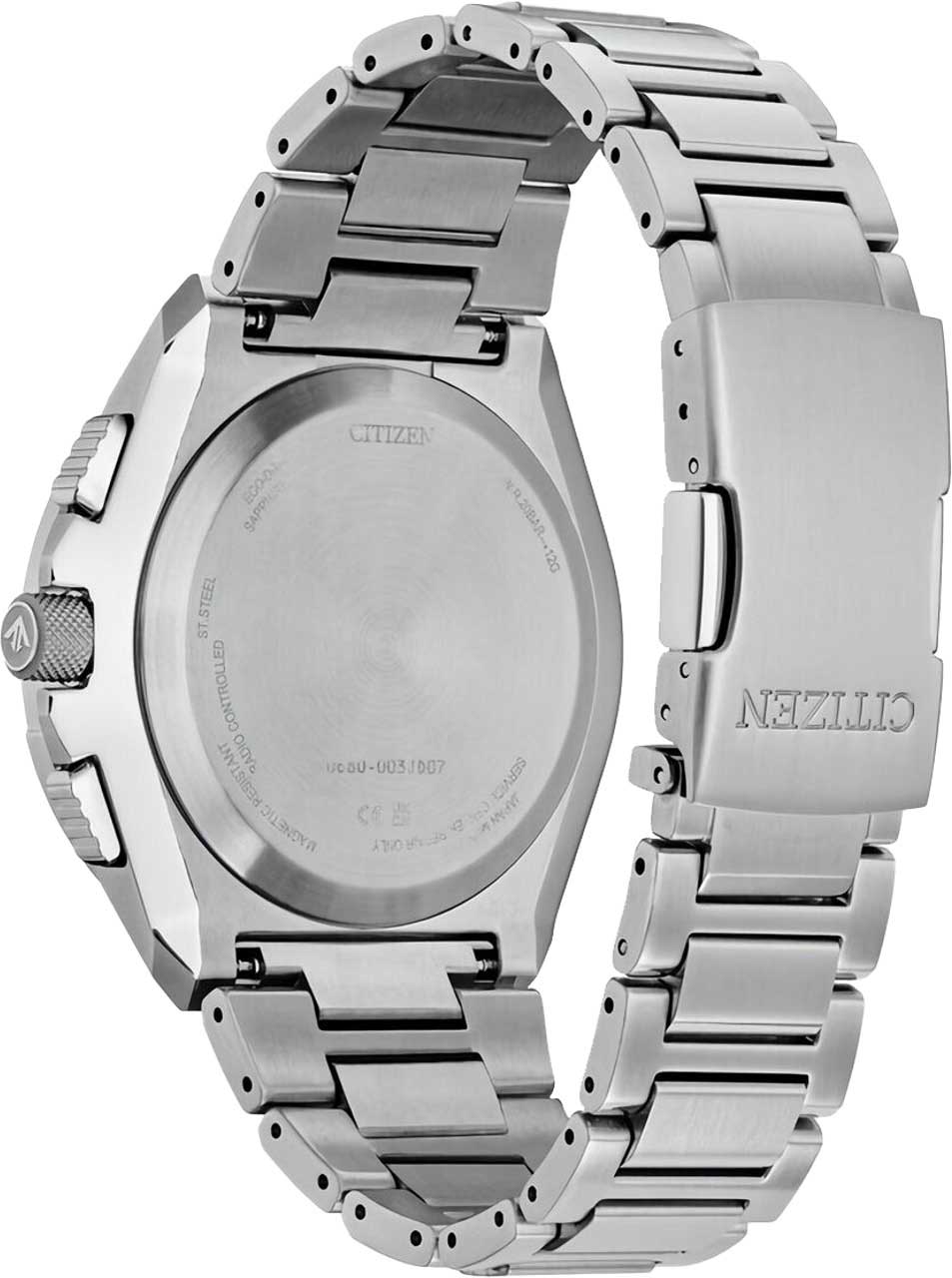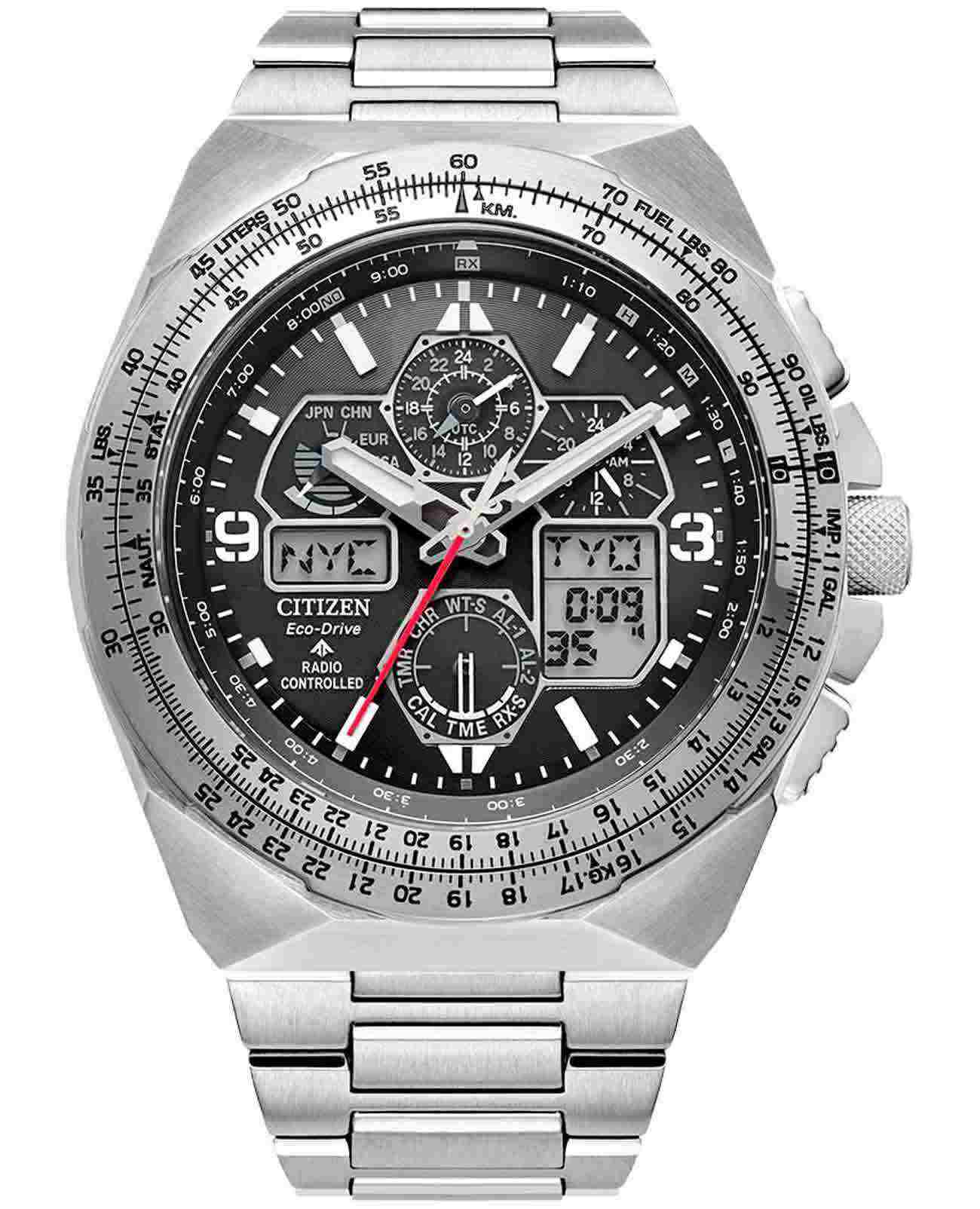 Citizen Promaster JY8120-58E часы-хронографХронографФункция позволяет измерять отрезки времени с особой точностью: часы, минуты, секунды. Верным признаком хронографа является наличие на циферблате 3 дополнительных окошек-счётчиков. с секундомеромСекундомерСекундоме́р — прибор, способный измерять интервалы времени с точностью до долей секунды. спортивного дизайна с высоким уровнем водозащиты. Корпус из нержавеющей стали диаметром 45,7 мм идеально сбалансирован. Сапфировое стеклоСапфировое стеклоПрочный и надёжный материал из кристалла сапфира синтетического происхождения, характеризующийся особой твёрдостью и устойчивостью к царапинам и повреждениям. с антибликовым покрытием обеспечивает отличную защиту циферблата от царапин. Часы работают на основе кварцевого механизма, питание от солнечной энергии. Стальной браслет на раскладной застёжкеРаскладная застёжкаТакой тип застёжки используется только на браслетах из металла. Она никогда не раскрывается полностью, происходит разделение на 2 и более частей. Раскладывающая застёжка снизит вероятность потери часов к минимуму. идеально дополняют дизайн часов, обеспечивая комфортное ношение. Стрелки и метки на циферблате имеют люминесцентное покрытиеЛюминесцентное покрытиеПозволяет считывать показания времени в темноте. Производители наносят на стрелки, часовые индексы, безель или поверхность циферблата светонакопительный состав, дающий холодное свечение. позволяющее легко определять время даже в темноте. Поворотный безельБезельВнешний ободок, закрепляющий стекло. В спортивных часах так называется поворотное кольцо с делениями на циферблате, выполняет роль таймера – замеряет отрезки времени на шкале. Неподвижный безель – элемент декора. Однонаправленно вращающийся безель на дайверских часах позволяет фиксировать моменты погружения и выныривания на поверхность.. Автоматический прием сигналов от радиовышек, расположенных в различных точках земного шара, которые передают временные сигналы от определенных атомных часов. Коррекция текущего времени радиосигналом на территории почти всей Европы, США, Японии и Китая. Функция индикации заряда (EOL) и предотвращения перезарядки. Мировое времяМировое время Полезное часовое усложнение, отображающее время в основных городах и известных областях по всему миру, оно связано с часовыми поясами, удобно для путешественников и бизнесменов. - 43 города, переход на зимнее и летнее время. Всемирное координированное время UTCUTCВсемирное кординационное время, не имеющее привязки к географическому положению Гринвича, основывается на атомном отсчёте времени. Регулировка времени осуществляется более точно, чем устаревшее GMT.