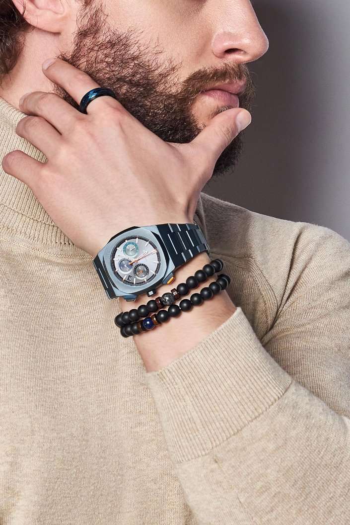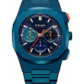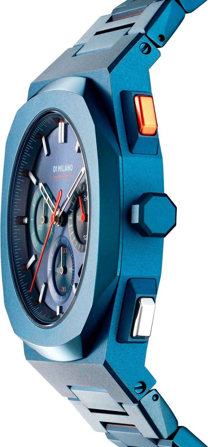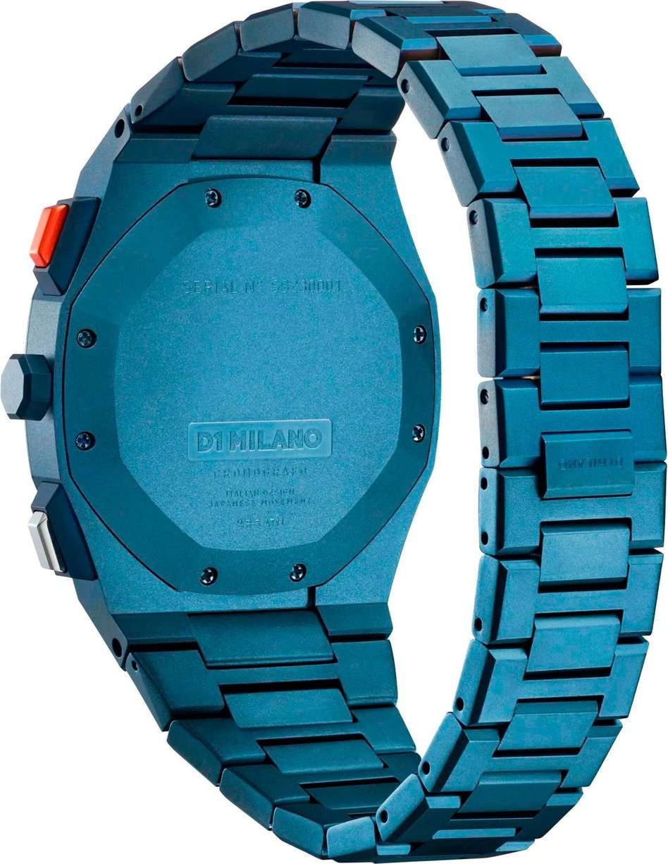 Элегантный хронограф D1 Milano Cronografo CHBJ12 идеальное воплощение мужественности и стиля. Этот многофункциональный хронографХронографФункция позволяет измерять отрезки времени с особой точностью: часы, минуты, секунды. Верным признаком хронографа является наличие на циферблате 3 дополнительных окошек-счётчиков. оснащен секундомеромСекундомерСекундоме́р — прибор, способный измерять интервалы времени с точностью до долей секунды. до 1 ч. Браслет, оснащенный раскладной застёжкойРаскладная застёжкаТакой тип застёжки используется только на браслетах из металла. Она никогда не раскрывается полностью, происходит разделение на 2 и более частей. Раскладывающая застёжка снизит вероятность потери часов к минимуму., и корпус выполнены из стали с синим PVD-покрытиемPVDУльтратонкое покрытие наносится в технике вакуумного напыления, сочетает в себе нитрид титана особой прочности со слоем золота или оксида хрома. Несёт в себе декоративную или защитную функцию.. Минималистичный дизайн циферблата с штриховыми метками, защищенный прочным сапфировым стекломСапфировое стеклоПрочный и надёжный материал из кристалла сапфира синтетического происхождения, характеризующийся особой твёрдостью и устойчивостью к царапинам и повреждениям., что привлекает внимание своей сдержанной красотой. Надежная конструкция с задней крышкой на 8 винтах и стильный браслет с удобной застежкой обеспечивают комфорт при ношении. Каждый экземпляр уникален благодаря индивидуальному серийному номеру.