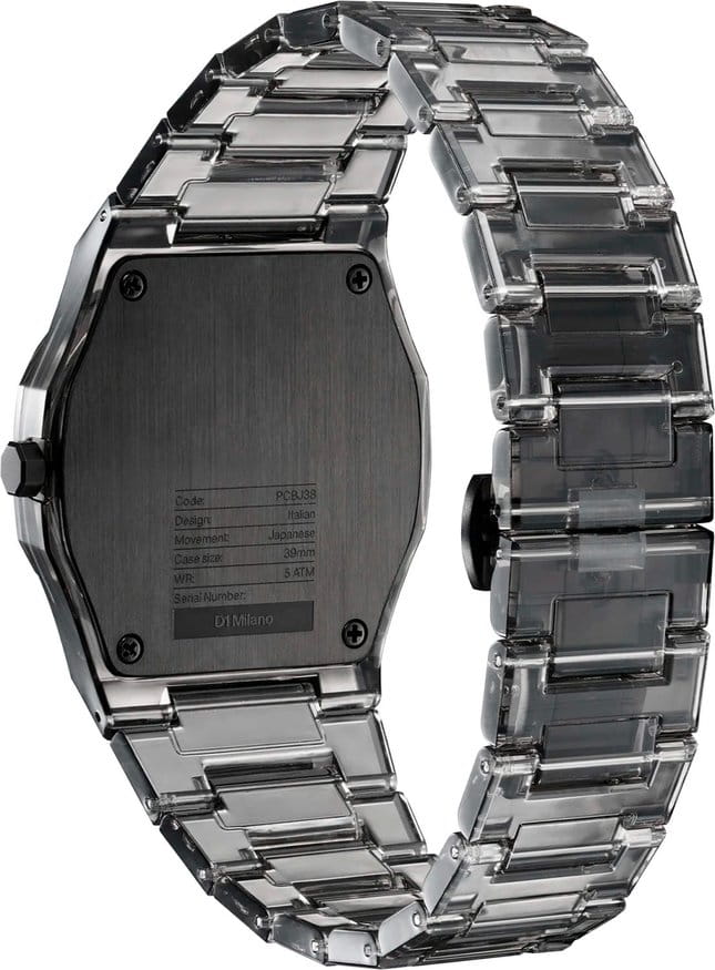 Часы D1 Milano Nylon EXP_Black NYBJ02 – модный и стильный аксессуар-унисекс лаконичного дизайна. Корпус выполнен из прозрачного серого нейлона. Черный матовый циферблат без индексов. Стрелки-скелетон из латуни. Задняя крышка из стали с черным PVD-покрытиемPVDУльтратонкое покрытие наносится в технике вакуумного напыления, сочетает в себе нитрид титана особой прочности со слоем золота или оксида хрома. Несёт в себе декоративную или защитную функцию. закреплена на 4 винтах. Ремешок из прозрачного нейлона имеет застёжку «бабочка» с кнопкамиЗастёжка "бабочка"Такой вид застёжки дополняется предохранителями, помогающими избежать случайного раскрытия браслета. Обладают изящным исполнением. .