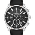 Мужские кварцевые часы-хронограф Daniel Klein — это фирменный аксессуар для ценящих своё время. Корпус диаметром 43 мм выполнен из нержавеющей стали. Циферблат чёрного цвета оформлен штрихами, стрелками и тремя субциферблатами хронографа. Присутствуют индикаторы 24-часового формата времени. Окошко даты расположено между 4 и 5 часами. Стрелки и метки с люминесцентным покрытиемЛюминесцентное покрытиеПозволяет считывать показания времени в темноте. Производители наносят на стрелки, часовые индексы, безель или поверхность циферблата светонакопительный состав, дающий холодное свечение., обеспечивающим хорошую читаемость в темноте. Циферблат защищён минеральным стекломМинеральное стеклоМинеральное стекло представляет собой искусственно выращенный минерал кварца. Такое стекло отличается особой устойчивостью к повреждениям и царапинам. Уступает по некоторым качествам сапфировому стеклу.. Часы оснащены кожаным ремешком на классической пряжке. Водонепроницаемость 50 м позволяет использовать часы в повседневных условиях. Идеальный выбор для тех, кто ценит турецкое качество и универсальный дизайн.