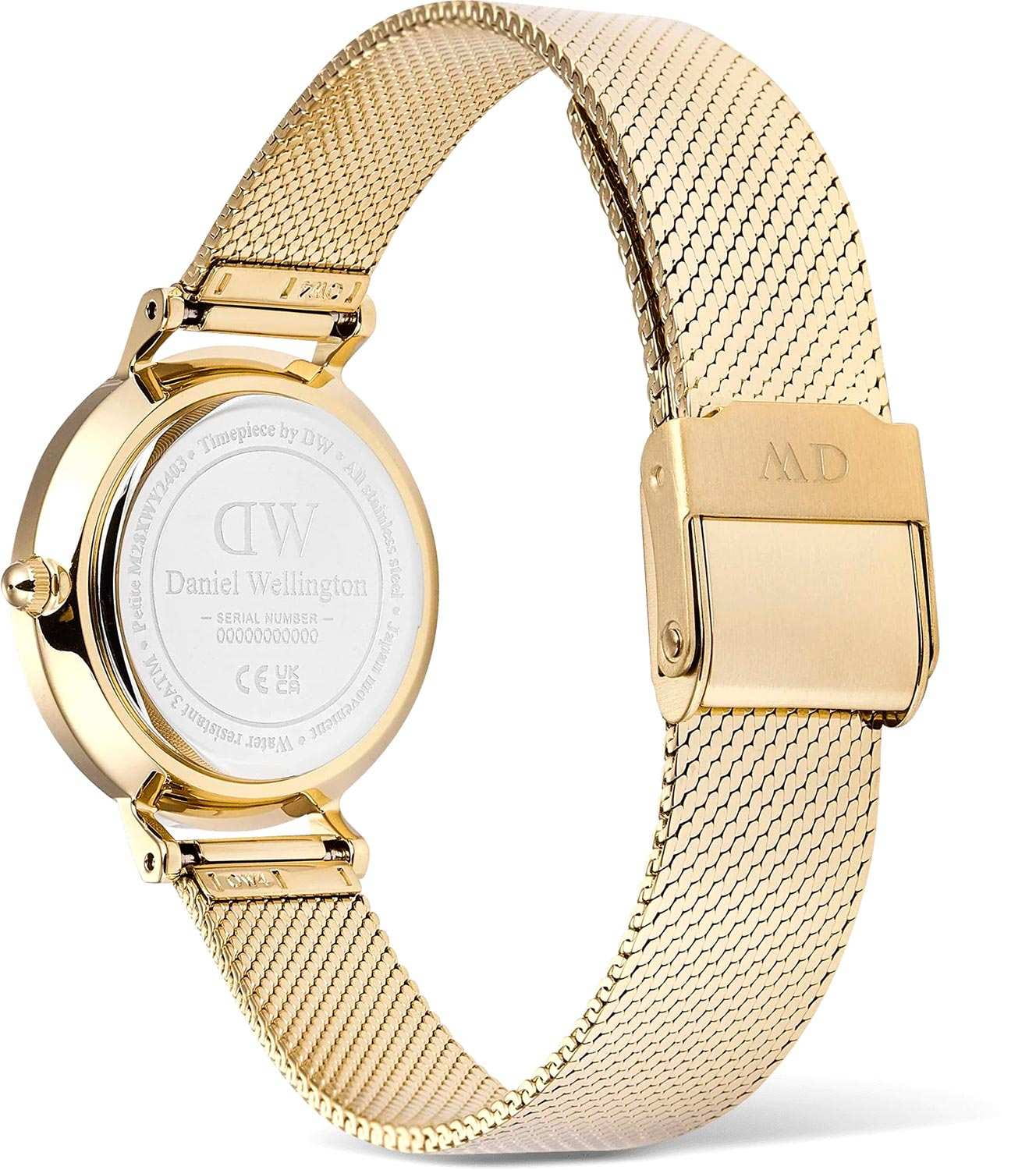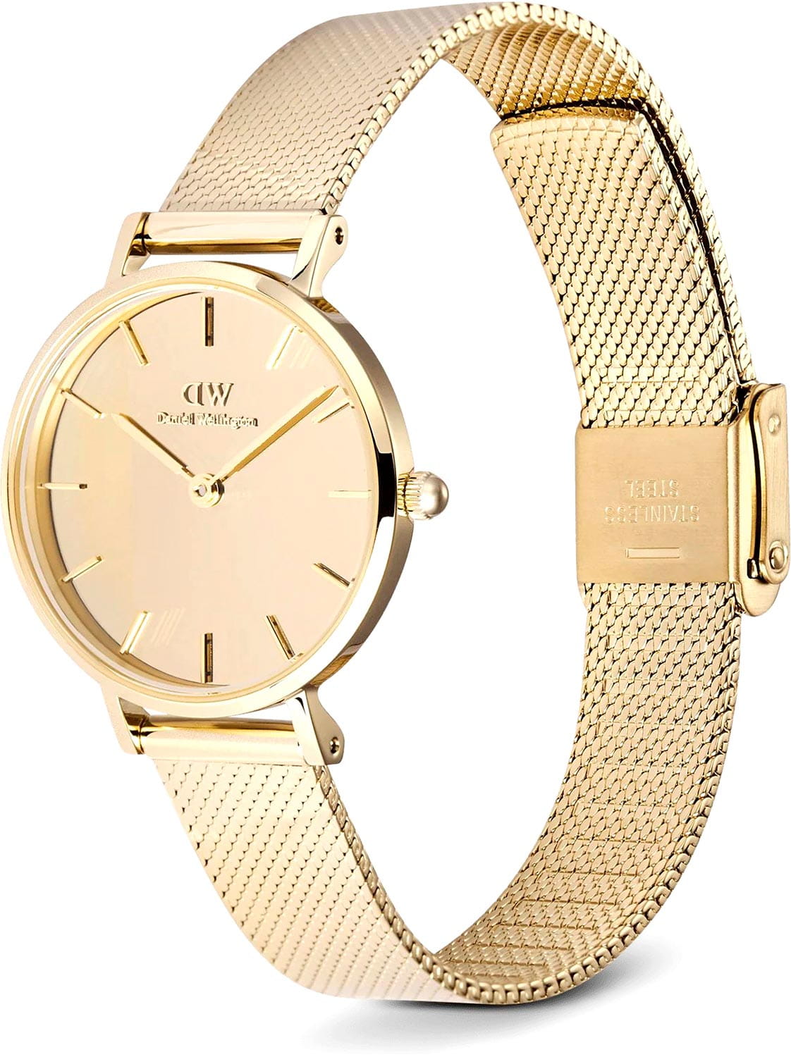 Женские наручные часы с минеральным стекломМинеральное стеклоМинеральное стекло представляет собой искусственно выращенный минерал кварца. Такое стекло отличается особой устойчивостью к повреждениям и царапинам. Уступает по некоторым качествам сапфировому стеклу. Daniel Wellington Petite Reflection Gold DW00100797, кварцевый механизм с высокой точностью. Корпус часов изготовлен из нержавеющей стали с PVD-покрытиемPVDУльтратонкое покрытие наносится в технике вакуумного напыления, сочетает в себе нитрид титана особой прочности со слоем золота или оксида хрома. Несёт в себе декоративную или защитную функцию..Накладные метки в виде штрихов. Японский кварцевый механизм. Рифленая заводная головка. Класс водозащиты: 30 метров, позволит защитить корпус от случайных брызг или капель дождя. Стальной браслет миланского плетения с PVD-покрытиемPVDУльтратонкое покрытие наносится в технике вакуумного напыления, сочетает в себе нитрид титана особой прочности со слоем золота или оксида хрома. Несёт в себе декоративную или защитную функцию. на раскладном замкеРаскладной замокДанный вариант застежки используется только на часах с металлическим браслетом. Отличительная особенность такого крепления в том, что длина браслета становится универсальной и вы можете самостоятельно отрегулировать нужный вам размер – застежка просто двигается по браслету часов..