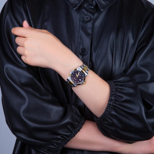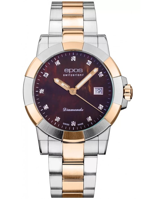 Женские кварцевые часы Epos из коллекции Ladies Diamonds — это элегантный аксессуар, сочетающий швейцарское качество и изысканный дизайн. Корпус диаметром 36 мм и толщиной 9 мм выполнен из нержавеющей стали 316L, безель с частичным PVD-покрытиемPVDУльтратонкое покрытие наносится в технике вакуумного напыления, сочетает в себе нитрид титана особой прочности со слоем золота или оксида хрома. Несёт в себе декоративную или защитную функцию. розового золота. Циферблат с перламутровой вставкой тёмного оттенка выполнен по технологии «солнечные лучи» и украшен синтетическими бриллиантами. Циферблат защищён сапфировым стекломСапфировое стеклоПрочный и надёжный материал из кристалла сапфира синтетического происхождения, характеризующийся особой твёрдостью и устойчивостью к царапинам и повреждениям.. Метки в виде точек инкрустированы бриллиантами. Стрелки с люминесцентным покрытиемЛюминесцентное покрытиеПозволяет считывать показания времени в темноте. Производители наносят на стрелки, часовые индексы, безель или поверхность циферблата светонакопительный состав, дающий холодное свечение., обеспечивающим хорошую читаемость в темноте. Окошко даты расположено в положении 3 часов. Механизм — швейцарский кварцевый калибр Ronda 705. Часы оснащены стальным браслетом комбинированного цвета на раскладной застёжкеРаскладная застёжкаТакой тип застёжки используется только на браслетах из металла. Она никогда не раскрывается полностью, происходит разделение на 2 и более частей. Раскладывающая застёжка снизит вероятность потери часов к минимуму.. Водонепроницаемость 50 м позволяет использовать часы в повседневных условиях.