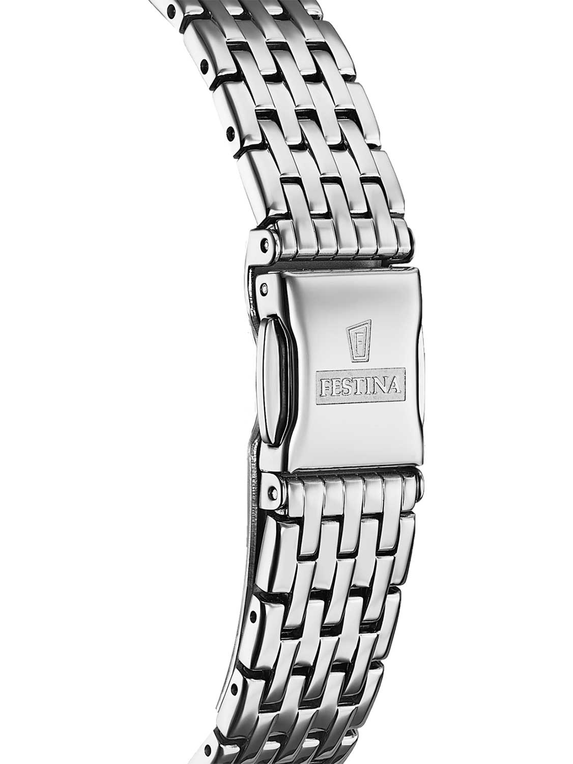 Женские кварцевые часы с окошком даты Festina Swiss Made F20019/2, кварцевый механизм с высокой точностью. Сапфировое стеклоСапфировое стеклоПрочный и надёжный материал из кристалла сапфира синтетического происхождения, характеризующийся особой твёрдостью и устойчивостью к царапинам и повреждениям. устойчивое к появлению царапин, обладающее высокой прозрачностью. Класс водозащиты: 50 метров, позволит защитить корпус от случайных брызг или капель дождя. Корпус часов изготовлен из стали. Стальной браслет на раскладной застёжкеРаскладная застёжкаТакой тип застёжки используется только на браслетах из металла. Она никогда не раскрывается полностью, происходит разделение на 2 и более частей. Раскладывающая застёжка снизит вероятность потери часов к минимуму.. Циферблат выполнен по технологии Sunray (солнечные лучи). Метки в виде штрихов. Две стрелки. Окошко даты.