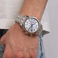 Эксклюзивный хронографХронографФункция позволяет измерять отрезки времени с особой точностью: часы, минуты, секунды. Верным признаком хронографа является наличие на циферблате 3 дополнительных окошек-счётчиков. с секундомеромСекундомерСекундоме́р — прибор, способный измерять интервалы времени с точностью до долей секунды., отличающийся продуманным дизайном и отделкой, придется по вкусу мужчинам, ценящим идеальное соотношение цены и качества.. Минеральное стеклоМинеральное стеклоМинеральное стекло представляет собой искусственно выращенный минерал кварца. Такое стекло отличается особой устойчивостью к повреждениям и царапинам. Уступает по некоторым качествам сапфировому стеклу. устойчивое к появлению царапин, обладающее высокой прозрачностью. Циферблат с люминесцентным покрытиемЛюминесцентное покрытиеПозволяет считывать показания времени в темноте. Производители наносят на стрелки, часовые индексы, безель или поверхность циферблата светонакопительный состав, дающий холодное свечение. стрелок и меток. Класс водозащиты: 50 метров, позволит защитить корпус от случайных брызг или капель дождя. Браслет с раскладной застёжкойРаскладная застёжкаТакой тип застёжки используется только на браслетах из металла. Она никогда не раскрывается полностью, происходит разделение на 2 и более частей. Раскладывающая застёжка снизит вероятность потери часов к минимуму..