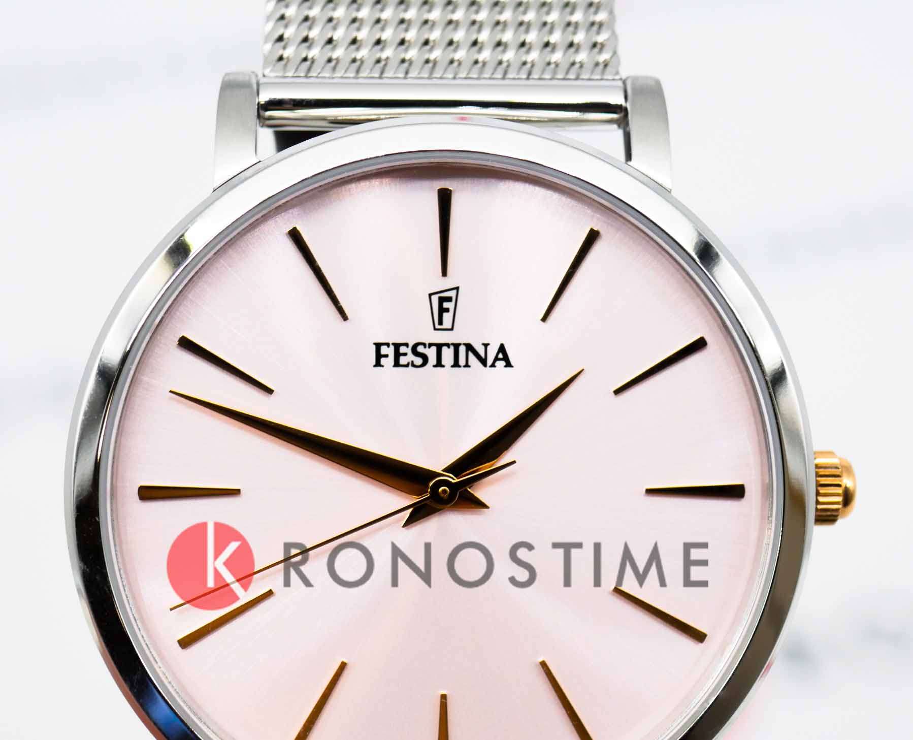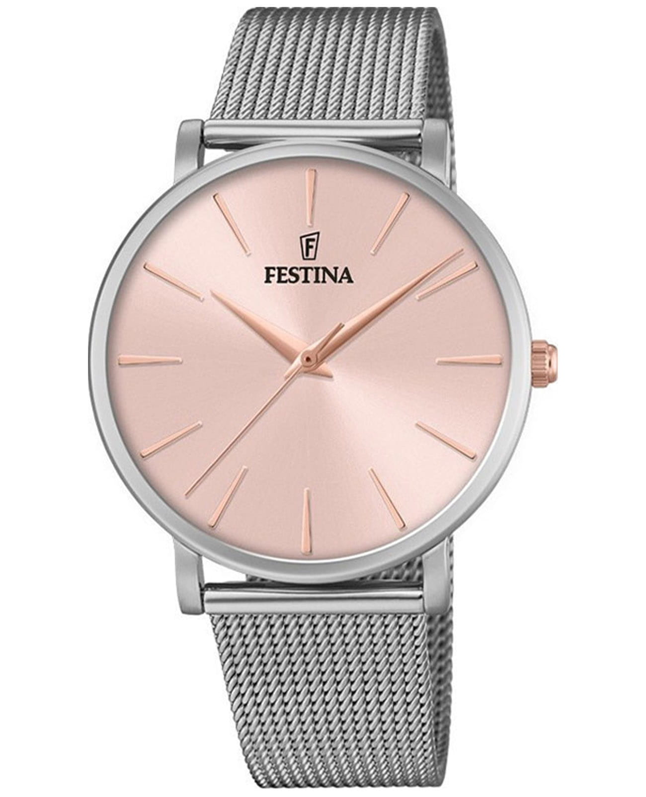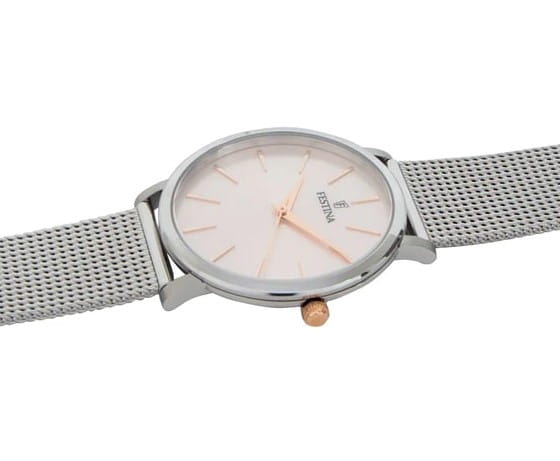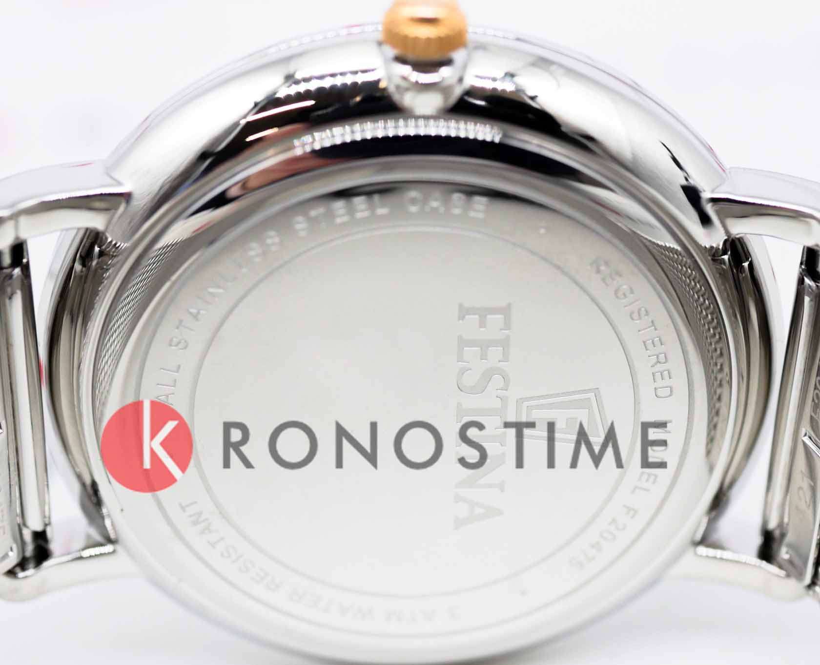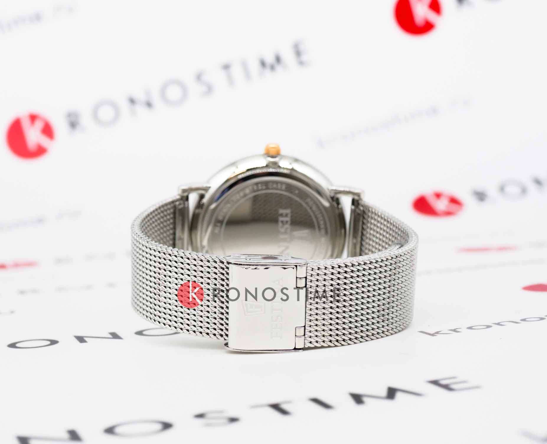 Женские кварцевые часы с минеральным стекломМинеральное стеклоМинеральное стекло представляет собой искусственно выращенный минерал кварца. Такое стекло отличается особой устойчивостью к повреждениям и царапинам. Уступает по некоторым качествам сапфировому стеклу. Festina Boyfriend F20475/2, кварцевый механизм с высокой точностью. Класс водозащиты: 30 метров, позволит защитить корпус от случайных брызг или капель дождя. Корпус часов изготовлен из стали. Стальной браслет миланского плетения на раскладной застёжкеРаскладная застёжкаТакой тип застёжки используется только на браслетах из металла. Она никогда не раскрывается полностью, происходит разделение на 2 и более частей. Раскладывающая застёжка снизит вероятность потери часов к минимуму..