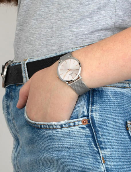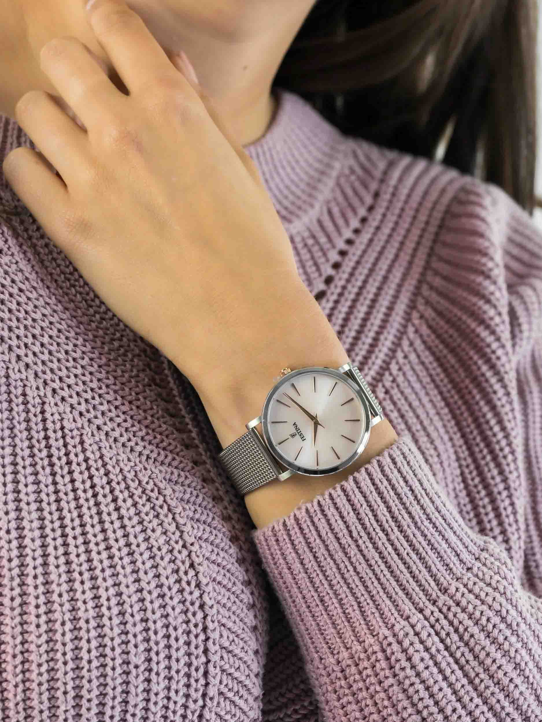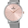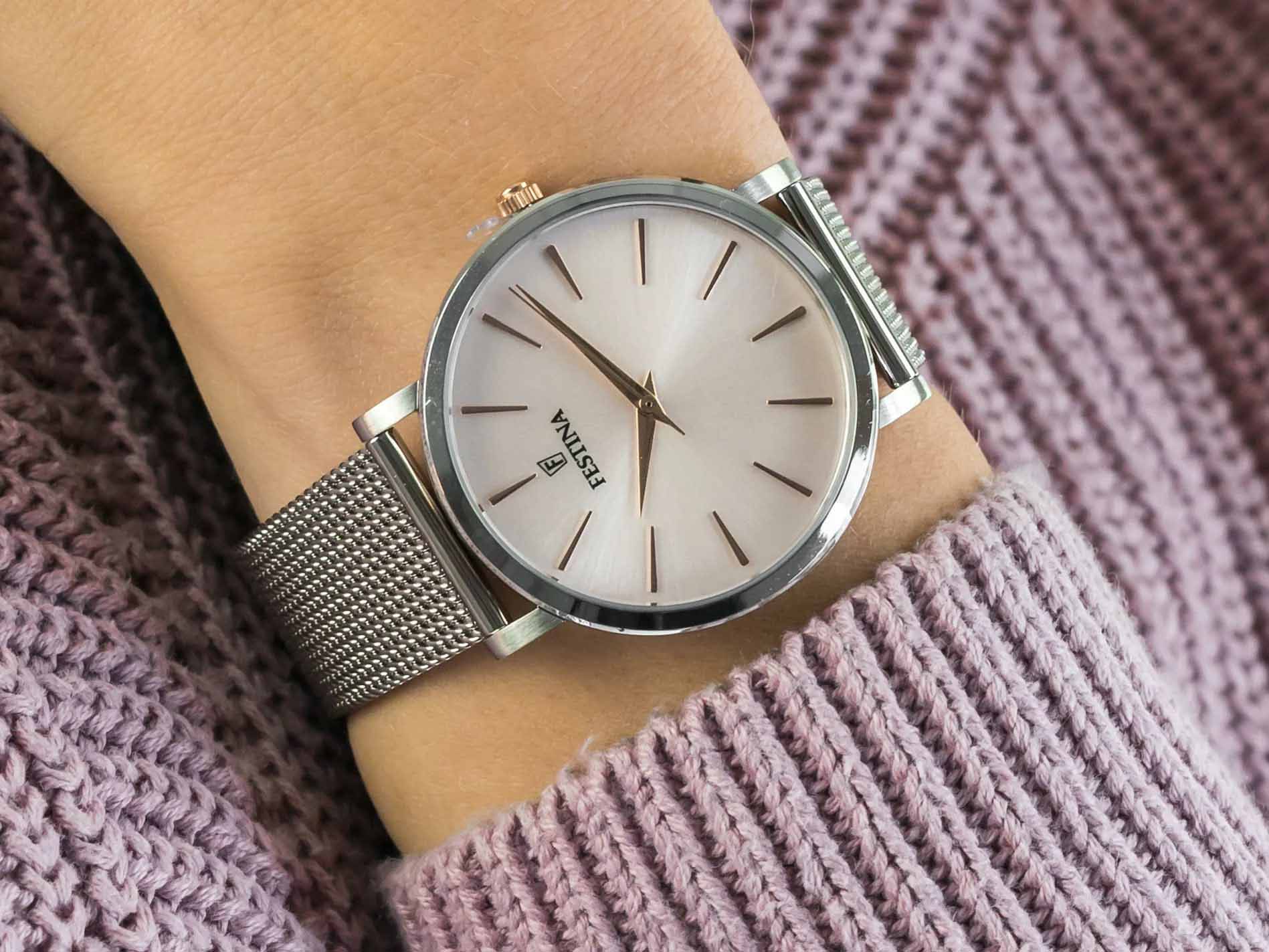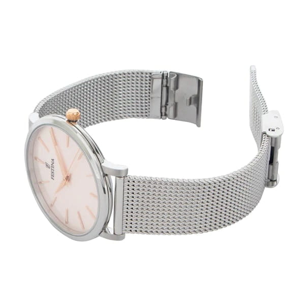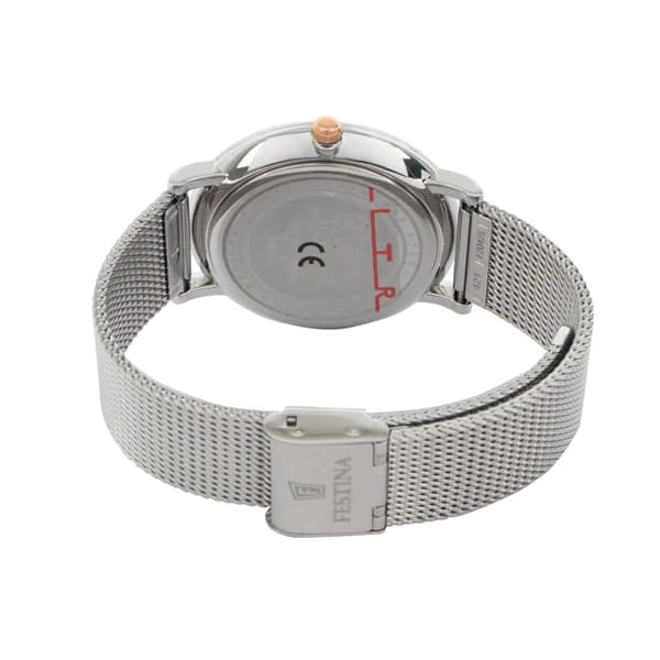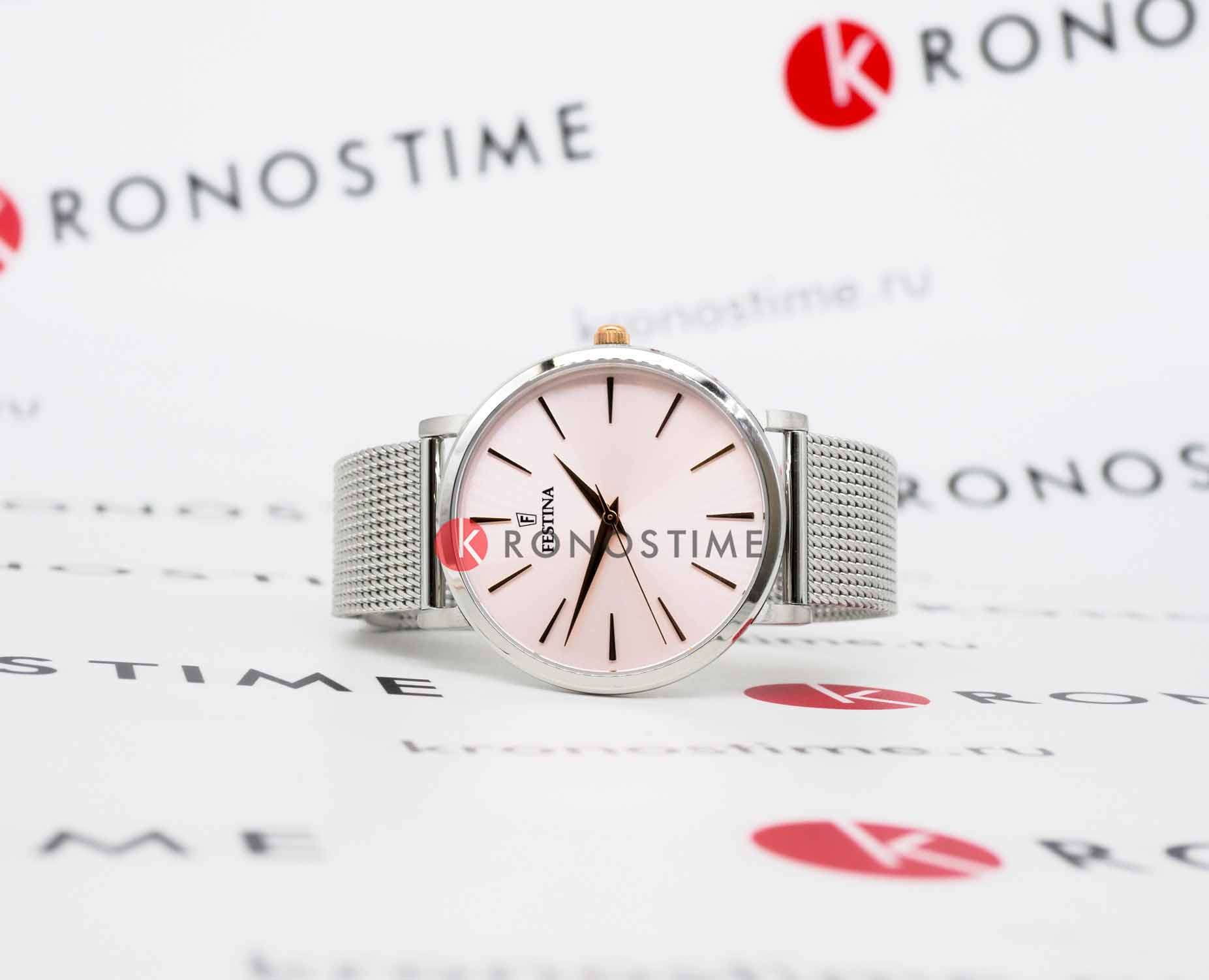 Женские кварцевые часы с минеральным стекломМинеральное стеклоМинеральное стекло представляет собой искусственно выращенный минерал кварца. Такое стекло отличается особой устойчивостью к повреждениям и царапинам. Уступает по некоторым качествам сапфировому стеклу. Festina Boyfriend F20475/2, кварцевый механизм с высокой точностью. Класс водозащиты: 30 метров, позволит защитить корпус от случайных брызг или капель дождя. Корпус часов изготовлен из стали. Стальной браслет миланского плетения на раскладной застёжкеРаскладная застёжкаТакой тип застёжки используется только на браслетах из металла. Она никогда не раскрывается полностью, происходит разделение на 2 и более частей. Раскладывающая застёжка снизит вероятность потери часов к минимуму..