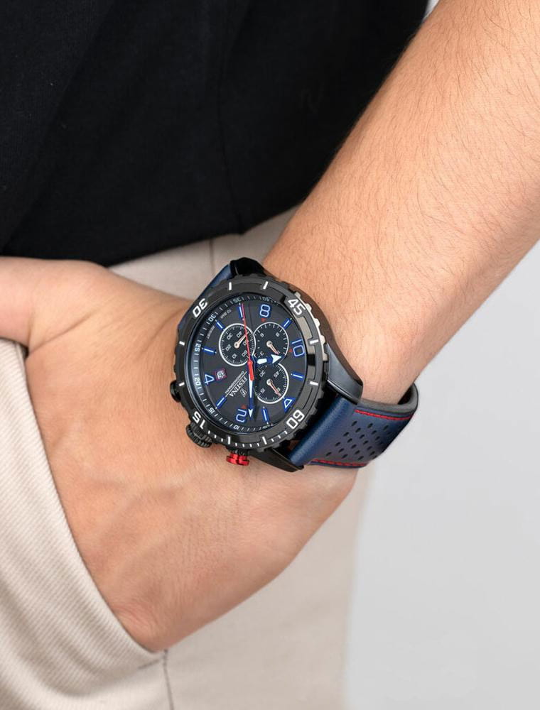 Часы-хронографХронографФункция позволяет измерять отрезки времени с особой точностью: часы, минуты, секунды. Верным признаком хронографа является наличие на циферблате 3 дополнительных окошек-счётчиков.. Кварцевый механизм с высокой точностью. Минеральное стеклоМинеральное стеклоМинеральное стекло представляет собой искусственно выращенный минерал кварца. Такое стекло отличается особой устойчивостью к повреждениям и царапинам. Уступает по некоторым качествам сапфировому стеклу. устойчивое к появлению царапин, обладающее высокой прозрачностью. Класс водозащиты: 100 метров, позволит плавать, нырять и заниматься другими водными видами спорта. Стрелки и метки с люминесцентным покрытиемЛюминесцентное покрытиеПозволяет считывать показания времени в темноте. Производители наносят на стрелки, часовые индексы, безель или поверхность циферблата светонакопительный состав, дающий холодное свечение.. Корпус часов изготовлен из нержавеющей стали c PVD-покрытиемPVDУльтратонкое покрытие наносится в технике вакуумного напыления, сочетает в себе нитрид титана особой прочности со слоем золота или оксида хрома. Несёт в себе декоративную или защитную функцию.. Кожаный ремешок с классической застежкой.