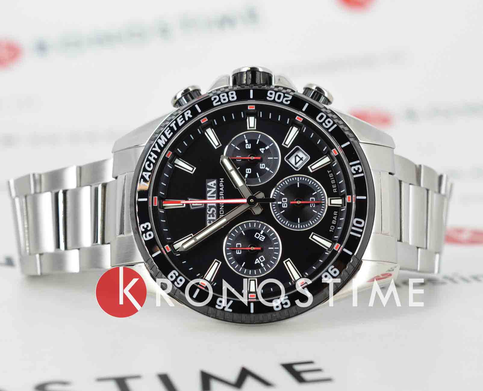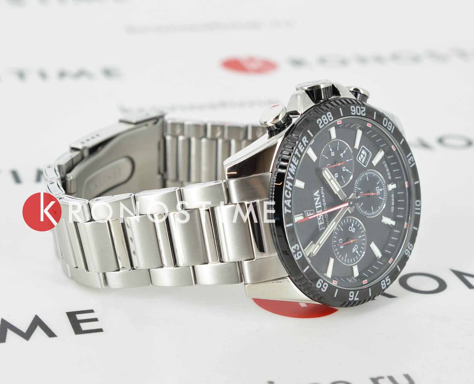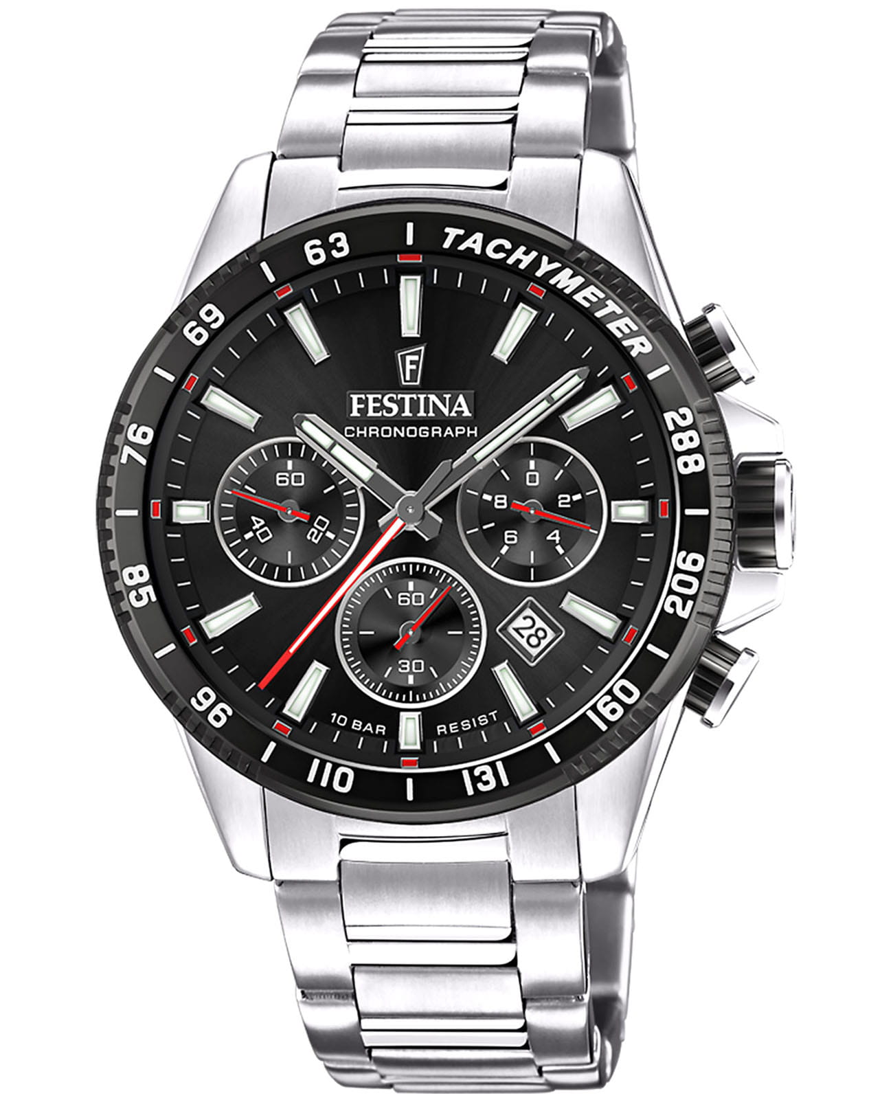 Festina F20560/6 — эксклюзивный хронографХронографФункция позволяет измерять отрезки времени с особой точностью: часы, минуты, секунды. Верным признаком хронографа является наличие на циферблате 3 дополнительных окошек-счётчиков. с дополнительными функциями секундомераСекундомерСекундоме́р — прибор, способный измерять интервалы времени с точностью до долей секунды. и тахиметраТахиметрРазмеченная шкала, располагается на ободке или безеле часов. Тахиметр позволяет рассчитать скорость на определённом участке пути, расстояние измеряется в километрах или милях., который выделяется продуманным дизайном и высоким качеством отделки. Эта модель станет отличным выбором для мужчин, ценящих идеальное соотношение цены и качества, а также практичность и надежность в ежедневном использовании. Минеральное стеклоМинеральное стеклоМинеральное стекло представляет собой искусственно выращенный минерал кварца. Такое стекло отличается особой устойчивостью к повреждениям и царапинам. Уступает по некоторым качествам сапфировому стеклу. обеспечивает отличную защиту от появления царапин и обладает высокой степенью прозрачности, что гарантирует превосходную читаемость показаний. Циферблат оснащён люминесцентным покрытиемЛюминесцентное покрытиеПозволяет считывать показания времени в темноте. Производители наносят на стрелки, часовые индексы, безель или поверхность циферблата светонакопительный состав, дающий холодное свечение. стрелок и меток, что позволяет легко определять время даже в условиях плохой освещенности. БезельБезельВнешний ободок, закрепляющий стекло. В спортивных часах так называется поворотное кольцо с делениями на циферблате, выполняет роль таймера – замеряет отрезки времени на шкале. Неподвижный безель – элемент декора. Однонаправленно вращающийся безель на дайверских часах позволяет фиксировать моменты погружения и выныривания на поверхность. с износостойким PVDPVDУльтратонкое покрытие наносится в технике вакуумного напыления, сочетает в себе нитрид титана особой прочности со слоем золота или оксида хрома. Несёт в себе декоративную или защитную функцию. покрытием подчеркивает современный стиль часов и повышает их долговечность. Класс водозащиты 100 метров позволяет использовать часы во время плавания, ныряния и активных водных видов спорта, не опасаясь за их сохранность. Стальной браслет на раскладной застёжкеРаскладная застёжкаТакой тип застёжки используется только на браслетах из металла. Она никогда не раскрывается полностью, происходит разделение на 2 и более частей. Раскладывающая застёжка снизит вероятность потери часов к минимуму. обеспечивает удобную посадку на запястье.