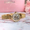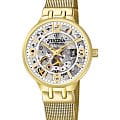 Женские механические часы-скелетоны Festina Automatic F20580/1, механический механизм (автоматический калибр) с высокой точностью. Сапфировое стеклоСапфировое стеклоПрочный и надёжный материал из кристалла сапфира синтетического происхождения, характеризующийся особой твёрдостью и устойчивостью к царапинам и повреждениям. устойчивое к появлению царапин, обладающее высокой прозрачностью. Класс водозащиты: 50 метров, позволит защитить корпус от случайных брызг или капель дождя. Корпус часов изготовлен из стали с PVD-покрытиемPVDУльтратонкое покрытие наносится в технике вакуумного напыления, сочетает в себе нитрид титана особой прочности со слоем золота или оксида хрома. Несёт в себе декоративную или защитную функцию.. Стальной миланского плетения браслет на раскладной застёжкеРаскладная застёжкаТакой тип застёжки используется только на браслетах из металла. Она никогда не раскрывается полностью, происходит разделение на 2 и более частей. Раскладывающая застёжка снизит вероятность потери часов к минимуму. с PVD-покрытиемPVDУльтратонкое покрытие наносится в технике вакуумного напыления, сочетает в себе нитрид титана особой прочности со слоем золота или оксида хрома. Несёт в себе декоративную или защитную функцию.. БезельБезельВнешний ободок, закрепляющий стекло. В спортивных часах так называется поворотное кольцо с делениями на циферблате, выполняет роль таймера – замеряет отрезки времени на шкале. Неподвижный безель – элемент декора. Однонаправленно вращающийся безель на дайверских часах позволяет фиксировать моменты погружения и выныривания на поверхность. с PVD-покрытиемPVDУльтратонкое покрытие наносится в технике вакуумного напыления, сочетает в себе нитрид титана особой прочности со слоем золота или оксида хрома. Несёт в себе декоративную или защитную функцию.. Циферблат с метками в виде штрихов и арабских цифр. Рифленая заводная головка.