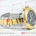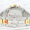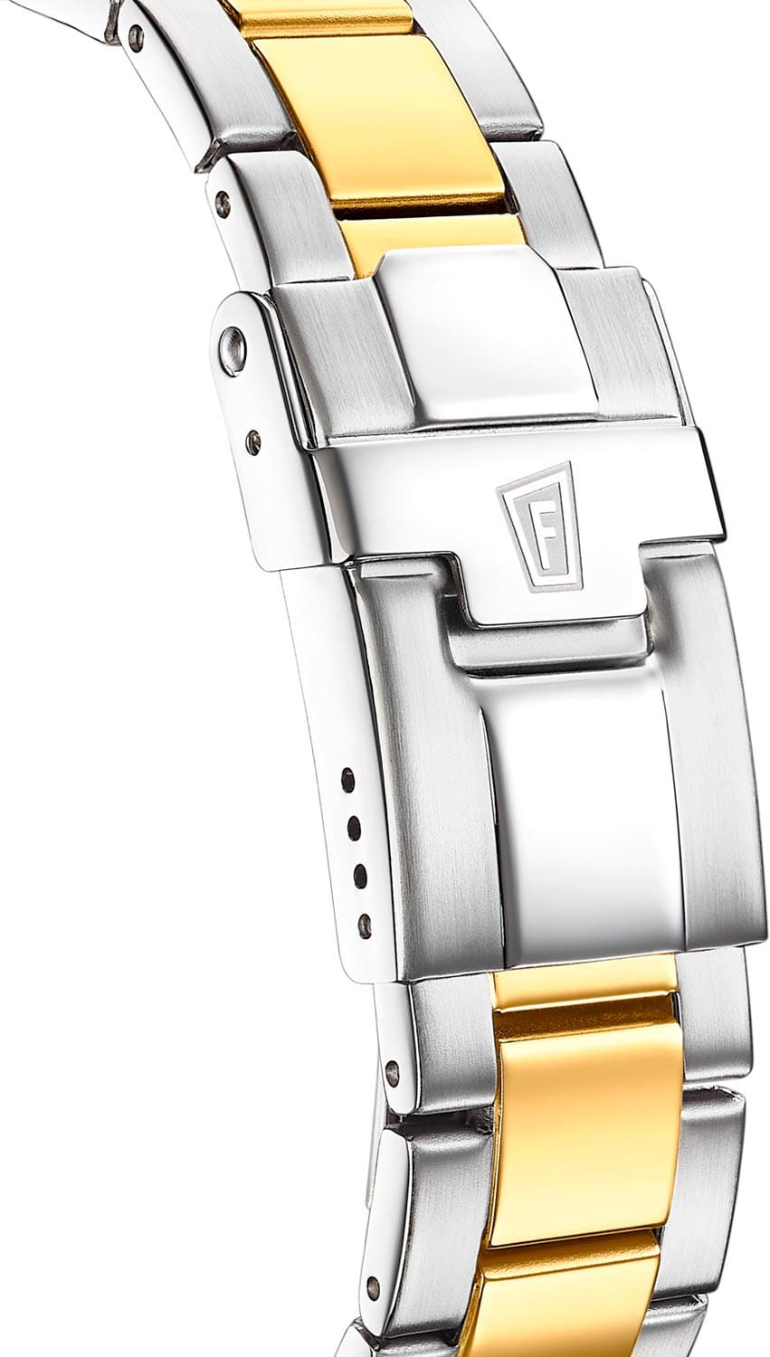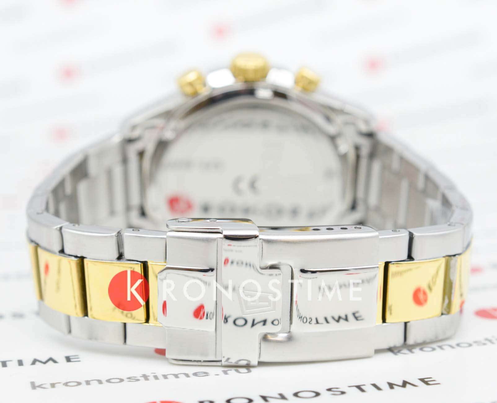 Яркий стиль и функциональность этих часов придутся по душе активной девушке. Часы-хронографХронографФункция позволяет измерять отрезки времени с особой точностью: часы, минуты, секунды. Верным признаком хронографа является наличие на циферблате 3 дополнительных окошек-счётчиков.. Кварцевый механизм с высокой точностью. Минеральное стеклоМинеральное стеклоМинеральное стекло представляет собой искусственно выращенный минерал кварца. Такое стекло отличается особой устойчивостью к повреждениям и царапинам. Уступает по некоторым качествам сапфировому стеклу. устойчивое к появлению царапин, обладающее высокой прозрачностью. Перламутровый циферблат. Метки украшены кристаллами. Класс водозащиты: 100 метров, позволит плавать, нырять и заниматься другими водными видами спорта. Корпус часов изготовлен из нержавеющей стали. БезельБезельВнешний ободок, закрепляющий стекло. В спортивных часах так называется поворотное кольцо с делениями на циферблате, выполняет роль таймера – замеряет отрезки времени на шкале. Неподвижный безель – элемент декора. Однонаправленно вращающийся безель на дайверских часах позволяет фиксировать моменты погружения и выныривания на поверхность. c IP-покрытиемIP-покрытиеМетод ионного напыления. Демонстрирует повышенную устойчивость к истиранию, окислению и химическим веществам. Под воздействием высокого давления и температуры около 1500°C молекулы металла надёжно соединяются с частицами корпуса часов.. Браслет с частичным IP-покрытиемIP-покрытиеМетод ионного напыления. Демонстрирует повышенную устойчивость к истиранию, окислению и химическим веществам. Под воздействием высокого давления и температуры около 1500°C молекулы металла надёжно соединяются с частицами корпуса часов. и с раскладной застёжкойРаскладная застёжкаТакой тип застёжки используется только на браслетах из металла. Она никогда не раскрывается полностью, происходит разделение на 2 и более частей. Раскладывающая застёжка снизит вероятность потери часов к минимуму..