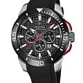 Часы-хронографХронографФункция позволяет измерять отрезки времени с особой точностью: часы, минуты, секунды. Верным признаком хронографа является наличие на циферблате 3 дополнительных окошек-счётчиков.. Кварцевый механизм с высокой точностью. Минеральное стеклоМинеральное стеклоМинеральное стекло представляет собой искусственно выращенный минерал кварца. Такое стекло отличается особой устойчивостью к повреждениям и царапинам. Уступает по некоторым качествам сапфировому стеклу. устойчивое к появлению царапин, обладающее высокой прозрачностью. Класс водозащиты: 100 метров, позволит плавать, нырять и заниматься другими водными видами спорта. Безель c PVD-покрытиемPVDУльтратонкое покрытие наносится в технике вакуумного напыления, сочетает в себе нитрид титана особой прочности со слоем золота или оксида хрома. Несёт в себе декоративную или защитную функцию.. Стрелки и метки с люминесцентным покрытиемЛюминесцентное покрытиеПозволяет считывать показания времени в темноте. Производители наносят на стрелки, часовые индексы, безель или поверхность циферблата светонакопительный состав, дающий холодное свечение.. Корпус часов изготовлен из нержавеющей стали. Каучуковый ремешок с классической застежкой