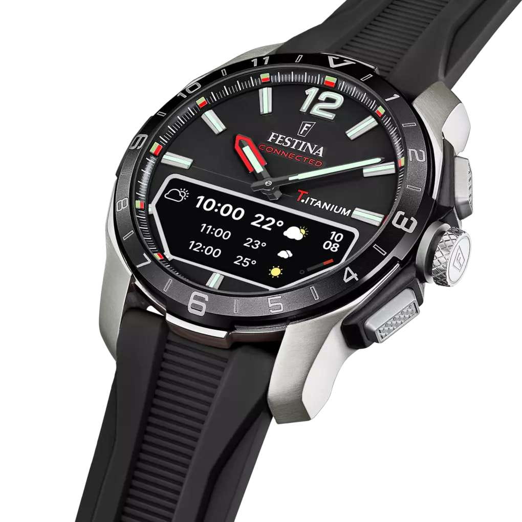 Мужские гибридные умные часы Festina Connected D — это современный аксессуар, сочетающий классический аналоговый дизайн и передовые технологии. Корпус диаметром 44 мм выполнен из лёгкого титана. БезельБезельВнешний ободок, закрепляющий стекло. В спортивных часах так называется поворотное кольцо с делениями на циферблате, выполняет роль таймера – замеряет отрезки времени на шкале. Неподвижный безель – элемент декора. Однонаправленно вращающийся безель на дайверских часах позволяет фиксировать моменты погружения и выныривания на поверхность. с IP-покрытиемIP-покрытиеМетод ионного напыления. Демонстрирует повышенную устойчивость к истиранию, окислению и химическим веществам. Под воздействием высокого давления и температуры около 1500°C молекулы металла надёжно соединяются с частицами корпуса часов.. Циферблат чёрного цвета оформлен штрихами и стрелками. В центре циферблата расположен небольшой OLED-дисплей для отображения цифровой информации. Циферблат защищён сапфировым стекломСапфировое стеклоПрочный и надёжный материал из кристалла сапфира синтетического происхождения, характеризующийся особой твёрдостью и устойчивостью к царапинам и повреждениям.. Часы оснащены функциями BluetoothBluetoothСовременная технология, позволяющая синхронизировать часы с телефоном и переносить данные. Часы с Bluetooth расширяют возможности вашего смартфона и делают его использование ещё более удобным., мирового времениМировое время Полезное часовое усложнение, отображающее время в основных городах и известных областях по всему миру, оно связано с часовыми поясами, удобно для путешественников и бизнесменов. , будильника, таймера обратного отсчёта, секундомера, а также уведомлений о звонках, сообщениях и напоминаниях. Стрелки и метки с люминесцентным покрытиемЛюминесцентное покрытиеПозволяет считывать показания времени в темноте. Производители наносят на стрелки, часовые индексы, безель или поверхность циферблата светонакопительный состав, дающий холодное свечение. обеспечивают читаемость в темноте. Часы оснащены силиконовым ремешком чёрного цвета на стандартной пряжке. Водонепроницаемость 30 м позволяет использовать часы в повседневных условиях. Идеальный выбор для тех, кто ценит стиль, точность и интеллектуальные функции.