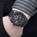 Наручные часы, предназначенные для мужчин. Внушительный спортивный дизайн, насыщенное элементами оформление. Кварцевый механизм с функцией хронографа. Корпус и браслет выполнены из нержавеющей стали 316L со стойким PVD покрытием. Минеральное стекло, устойчивое к возникновению царапин. Рельефный циферблат с накладными часовыми метками. Задняя крышка имеет винтовое соединение с корпусом. Водостойкость 50 метров (5АТМ).