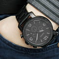 Наручные часы, предназначенные для мужчин. Внушительный спортивный дизайн, насыщенное элементами оформление.  Круглый корпус и браслет часов выполнены из высокопрочной стали с PVD покрытием. Черный фон циферблата и серые элементы дизайна. Водонепроницаемость часов 5 ATM. Минеральное стекло, устойчивое к появлению царапин. Из дополнительных  функций в часах присутствуют секундомер, хронограф.