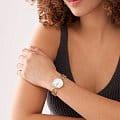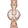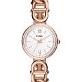 Женские американские часы  с минеральным стекломМинеральное стеклоМинеральное стекло представляет собой искусственно выращенный минерал кварца. Такое стекло отличается особой устойчивостью к повреждениям и царапинам. Уступает по некоторым качествам сапфировому стеклу. Fossil Carlie ES5273, кварцевый механизм с высокой точностью. Корпус и браслет часов изготовлены из нержавеющей стали  с IP-покрытиемIP-покрытиеМетод ионного напыления. Демонстрирует повышенную устойчивость к истиранию, окислению и химическим веществам. Под воздействием высокого давления и температуры около 1500°C молекулы металла надёжно соединяются с частицами корпуса часов.. Стрелки с люминесцентным покрытиемЛюминесцентное покрытиеПозволяет считывать показания времени в темноте. Производители наносят на стрелки, часовые индексы, безель или поверхность циферблата светонакопительный состав, дающий холодное свечение.. Рифленая заводная головка с защитой. Класс водозащиты: 50 метров, позволит защитить корпус от случайных брызг или капель дождя. Стальной браслет в виде звеньев на ювелирной застежке.