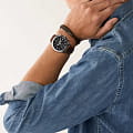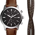 Мужские наручные часы-хронографХронографФункция позволяет измерять отрезки времени с особой точностью: часы, минуты, секунды. Верным признаком хронографа является наличие на циферблате 3 дополнительных окошек-счётчиков. Fossil Townsman FS5967SET с надёжным кварцевым механизмом. Корпус часов изготовлен из нержавеющей стали. Минеральное стеклоМинеральное стеклоМинеральное стекло представляет собой искусственно выращенный минерал кварца. Такое стекло отличается особой устойчивостью к повреждениям и царапинам. Уступает по некоторым качествам сапфировому стеклу. устойчивое к мелким механическим повреждениям. Кожаный ремешок на стандартной застёжке. Класс водозащиты: 50 метров, позволит защитить корпус от случайных брызг или капель дождя. Стрелки с люминесцентным покрытиемЛюминесцентное покрытиеПозволяет считывать показания времени в темноте. Производители наносят на стрелки, часовые индексы, безель или поверхность циферблата светонакопительный состав, дающий холодное свечение.. В комплекте стильный кожаный браслет.