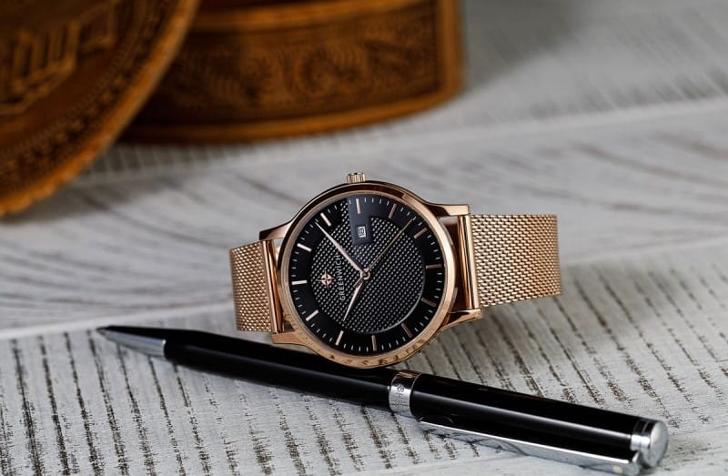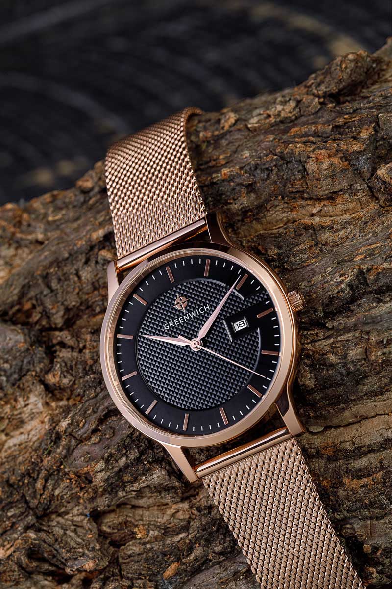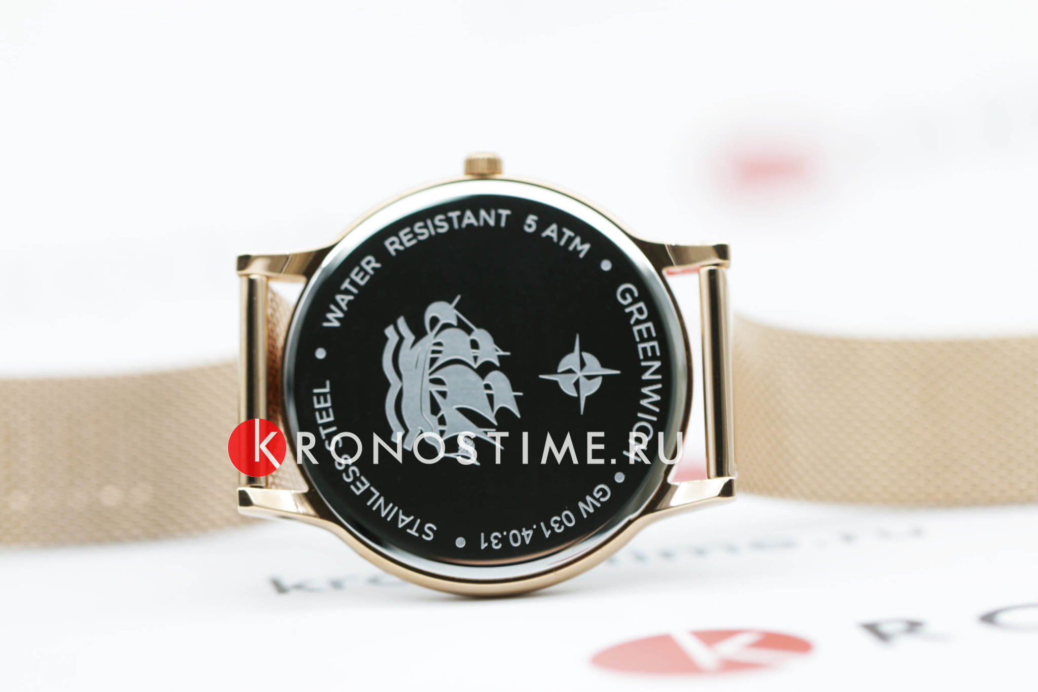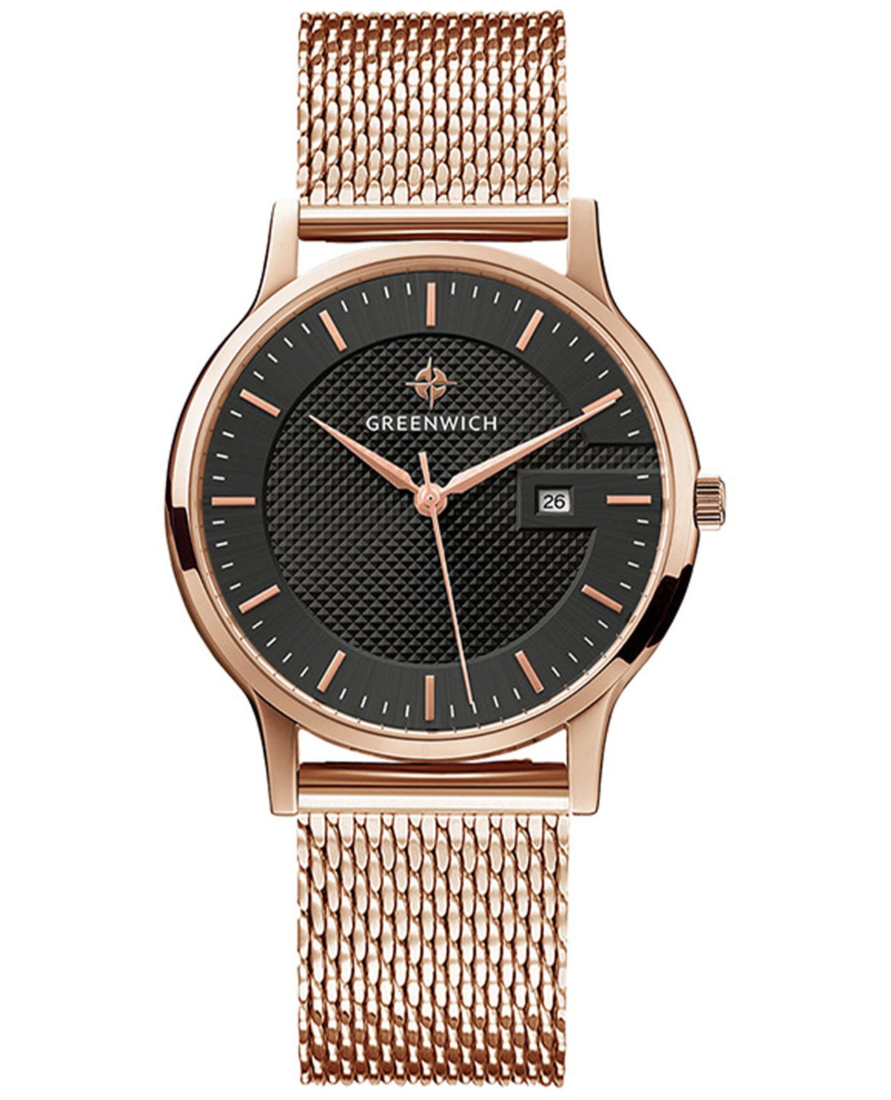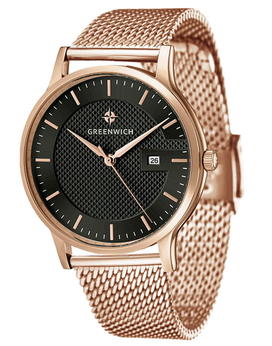 Мужские английские часы с минеральным стекломМинеральное стеклоМинеральное стекло представляет собой искусственно выращенный минерал кварца. Такое стекло отличается особой устойчивостью к повреждениям и царапинам. Уступает по некоторым качествам сапфировому стеклу. Greenwich Breeze GW 031.40.31, кварцевый механизм с высокой точностью. Класс водозащиты: 50 метров, позволит защитить корпус от случайных брызг или капель дождя. Корпус часов изготовлен из стали с IP-покрытиемIP-покрытиеМетод ионного напыления. Демонстрирует повышенную устойчивость к истиранию, окислению и химическим веществам. Под воздействием высокого давления и температуры около 1500°C молекулы металла надёжно соединяются с частицами корпуса часов. цвета розовое золото. Браслет с раскладной застёжкойРаскладная застёжкаТакой тип застёжки используется только на браслетах из металла. Она никогда не раскрывается полностью, происходит разделение на 2 и более частей. Раскладывающая застёжка снизит вероятность потери часов к минимуму..