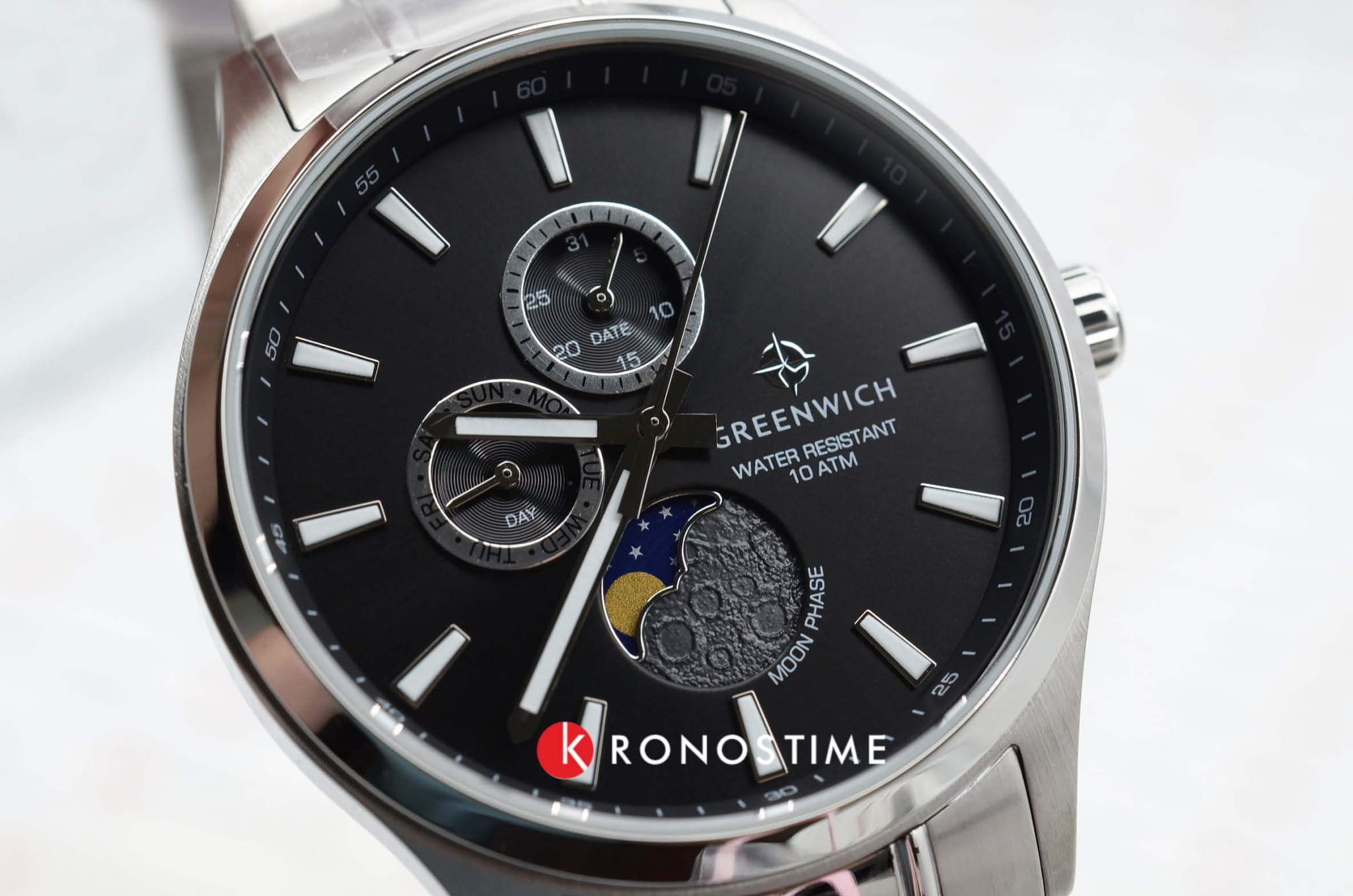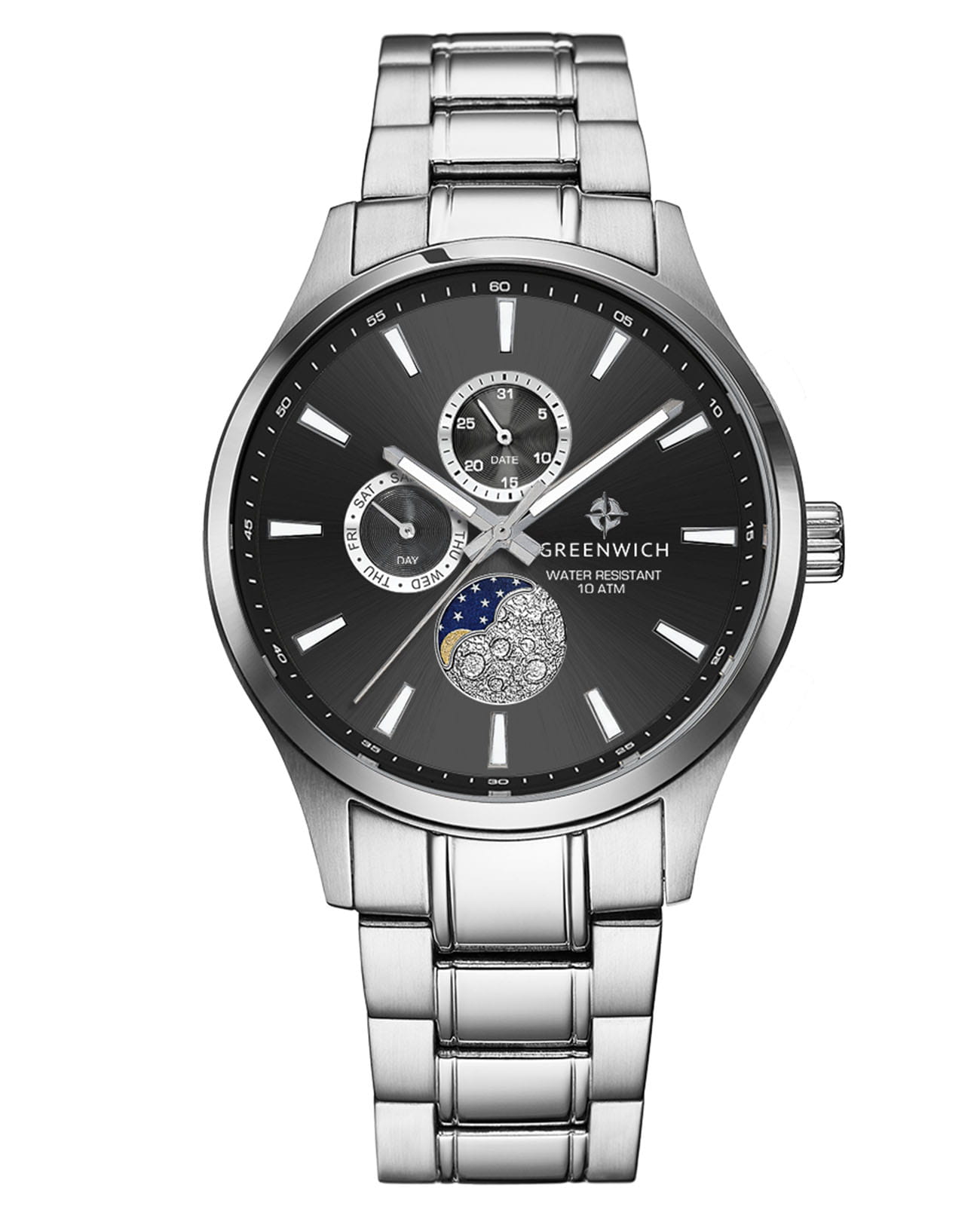 Мужские английские часы с хронографом Greenwich Moon Walker gw 058.10.31, кварцевый механизм с высокой точностью. Класс водозащиты: 100 метров, позволит плавать, нырять и заниматься другими водными видами спорта. Корпус часов изготовлен из стали, серебристого цвета. Браслет из нержавеющей стали надежно удерживает на запястье застежка-клипса с логотипом бренда. Кварцевый механизм показывает время с точностью до секунды, дату, день недели. Все индикаторы на черном циферблате хорошо читаются, они выделены накладными рамками с зеркальной полировкой. В позиции «6 часов» расположен индикатор лунных фаз. Крупные стрелки и риски видны при любых условиях благодаря люминесцентной подсветкеЛюминесцентное покрытиеПозволяет считывать показания времени в темноте. Производители наносят на стрелки, часовые индексы, безель или поверхность циферблата светонакопительный состав, дающий холодное свечение., которое в темноте светится зеленоватым свечением.