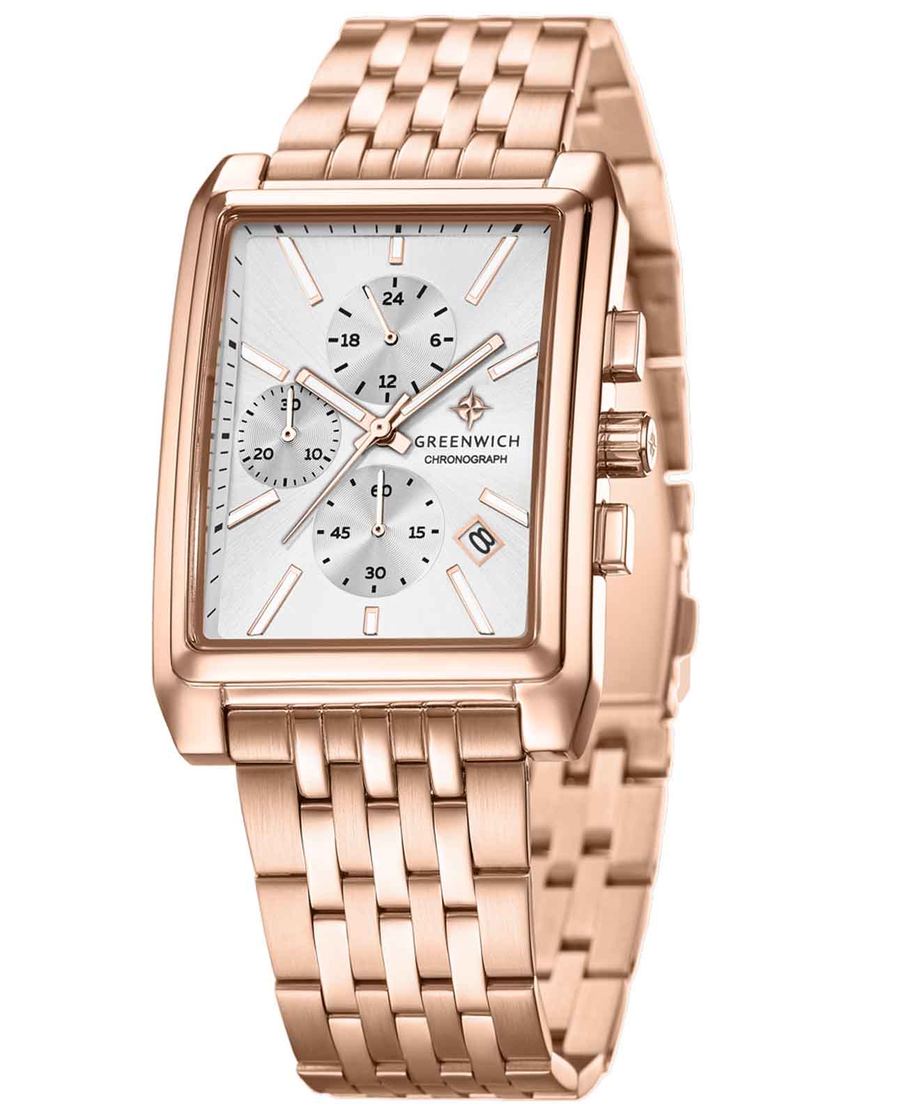 Мужские часы-хронографХронографФункция позволяет измерять отрезки времени с особой точностью: часы, минуты, секунды. Верным признаком хронографа является наличие на циферблате 3 дополнительных окошек-счётчиков. Greenwich Galeon Chrono GW 553.40.13, кварцевый механизм с минеральным стекломМинеральное стеклоМинеральное стекло представляет собой искусственно выращенный минерал кварца. Такое стекло отличается особой устойчивостью к повреждениям и царапинам. Уступает по некоторым качествам сапфировому стеклу.. Корпус из нержавеющей стали с PVD-покрытиемPVDУльтратонкое покрытие наносится в технике вакуумного напыления, сочетает в себе нитрид титана особой прочности со слоем золота или оксида хрома. Несёт в себе декоративную или защитную функцию.. Стрелки и метки с люминесцентным покрытиемЛюминесцентное покрытиеПозволяет считывать показания времени в темноте. Производители наносят на стрелки, часовые индексы, безель или поверхность циферблата светонакопительный состав, дающий холодное свечение.. Окошко даты находится в положении между 4 и 5 часами. Класс водозащиты: 50 метров, позволит защитить корпус от случайных брызг или капель дождя. Стальной браслет с PVD-покрытиемPVDУльтратонкое покрытие наносится в технике вакуумного напыления, сочетает в себе нитрид титана особой прочности со слоем золота или оксида хрома. Несёт в себе декоративную или защитную функцию. на раскладной застёжкеРаскладная застёжкаТакой тип застёжки используется только на браслетах из металла. Она никогда не раскрывается полностью, происходит разделение на 2 и более частей. Раскладывающая застёжка снизит вероятность потери часов к минимуму..