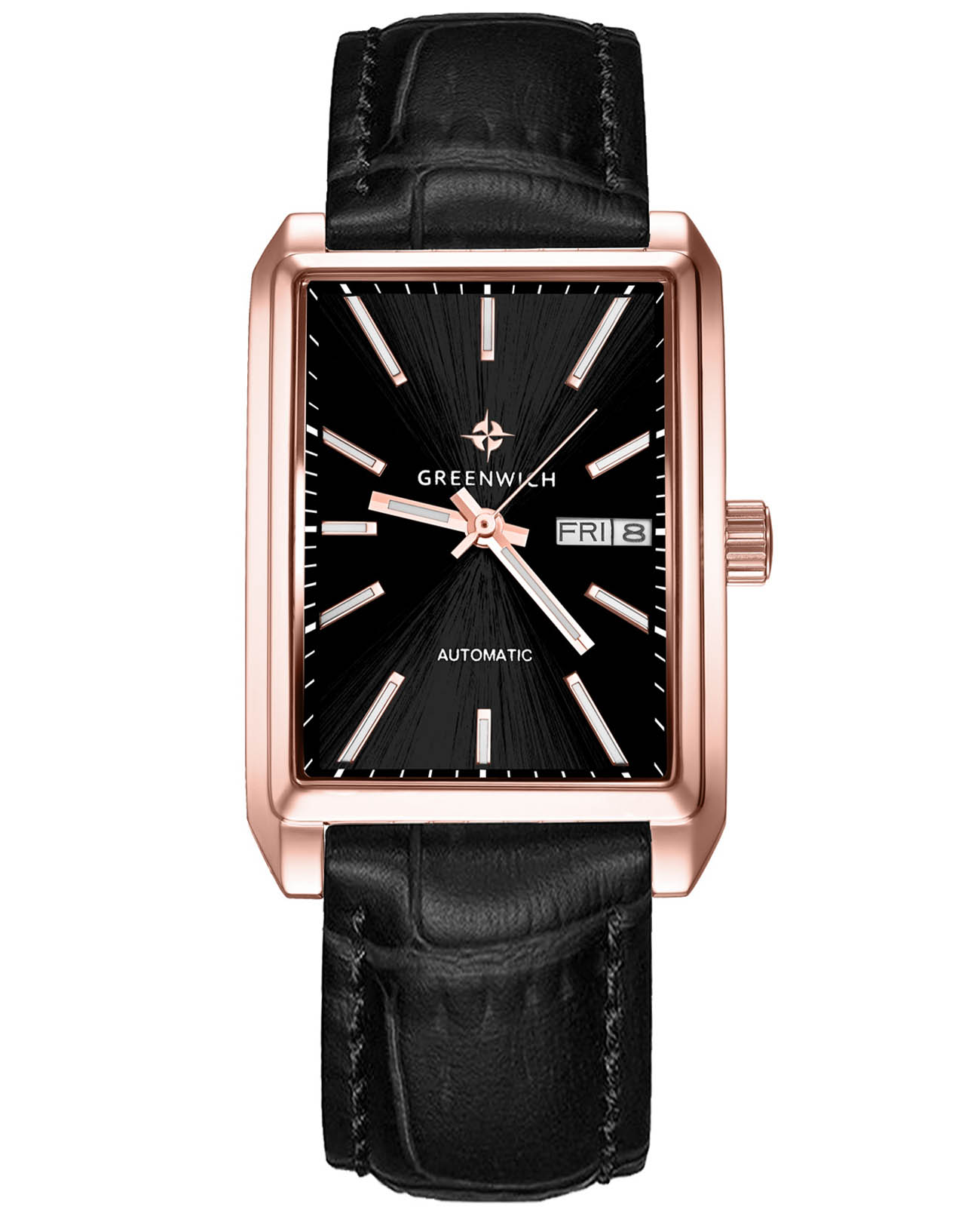 Мужские часы с минеральным стекломМинеральное стеклоМинеральное стекло представляет собой искусственно выращенный минерал кварца. Такое стекло отличается особой устойчивостью к повреждениям и царапинам. Уступает по некоторым качествам сапфировому стеклу. Greenwich Caravel GW 564.41.11, представляют собой классический вариант для повседневной носки. Корпус часов выполнен из нержавеющей стали с PVD-покрытиемPVDУльтратонкое покрытие наносится в технике вакуумного напыления, сочетает в себе нитрид титана особой прочности со слоем золота или оксида хрома. Несёт в себе декоративную или защитную функцию.. Окошко даты и дня недели находится в положении 3 часа. Стрелки с люминесцентным покрытиемЛюминесцентное покрытиеПозволяет считывать показания времени в темноте. Производители наносят на стрелки, часовые индексы, безель или поверхность циферблата светонакопительный состав, дающий холодное свечение.. Кожаный ремешок на стандартной застежке.