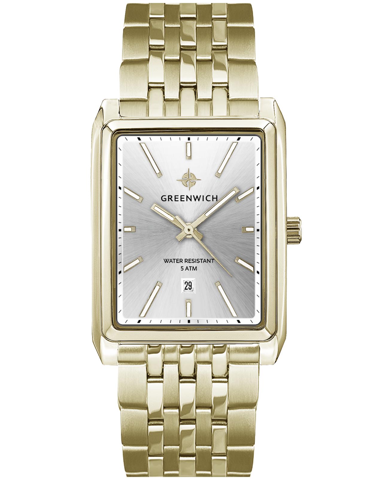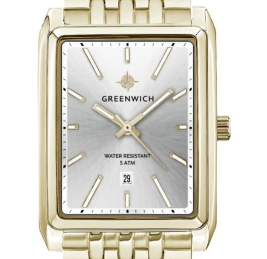 Мужские часы с минеральным стекломМинеральное стеклоМинеральное стекло представляет собой искусственно выращенный минерал кварца. Такое стекло отличается особой устойчивостью к повреждениям и царапинам. Уступает по некоторым качествам сапфировому стеклу. Greenwich Galeon GW 571.20.13 представляют собой классический вариант для повседневной носки. Корпус часов выполнен из нержавеющей стали с IP-покрытиемIP-покрытиеМетод ионного напыления. Демонстрирует повышенную устойчивость к истиранию, окислению и химическим веществам. Под воздействием высокого давления и температуры около 1500°C молекулы металла надёжно соединяются с частицами корпуса часов.. Окошко даты находится в положении 6 часов. Стрелки с люминесцентным покрытиемЛюминесцентное покрытиеПозволяет считывать показания времени в темноте. Производители наносят на стрелки, часовые индексы, безель или поверхность циферблата светонакопительный состав, дающий холодное свечение.. Стальной браслет с IP-покрытиемIP-покрытиеМетод ионного напыления. Демонстрирует повышенную устойчивость к истиранию, окислению и химическим веществам. Под воздействием высокого давления и температуры около 1500°C молекулы металла надёжно соединяются с частицами корпуса часов. на раскладной застёжкеРаскладная застёжкаТакой тип застёжки используется только на браслетах из металла. Она никогда не раскрывается полностью, происходит разделение на 2 и более частей. Раскладывающая застёжка снизит вероятность потери часов к минимуму..