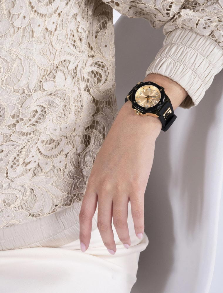 Женские наручные часы Guess Sport Steel GW0555L2 с минеральным стекломМинеральное стеклоМинеральное стекло представляет собой искусственно выращенный минерал кварца. Такое стекло отличается особой устойчивостью к повреждениям и царапинам. Уступает по некоторым качествам сапфировому стеклу., кварцевый механизм с высокой точностью. Стрелки и метки с люминесцентным покрытиемЛюминесцентное покрытиеПозволяет считывать показания времени в темноте. Производители наносят на стрелки, часовые индексы, безель или поверхность циферблата светонакопительный состав, дающий холодное свечение.. Класс водозащиты: 50 метров, позволит защитить корпус от случайных брызг или капель дождя. Корпус часов и безельБезельВнешний ободок, закрепляющий стекло. В спортивных часах так называется поворотное кольцо с делениями на циферблате, выполняет роль таймера – замеряет отрезки времени на шкале. Неподвижный безель – элемент декора. Однонаправленно вращающийся безель на дайверских часах позволяет фиксировать моменты погружения и выныривания на поверхность. изготовлены из стали с IP-покрытиемIP-покрытиеМетод ионного напыления. Демонстрирует повышенную устойчивость к истиранию, окислению и химическим веществам. Под воздействием высокого давления и температуры около 1500°C молекулы металла надёжно соединяются с частицами корпуса часов.. Силиконовый ремешок с классической застежкой.