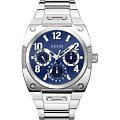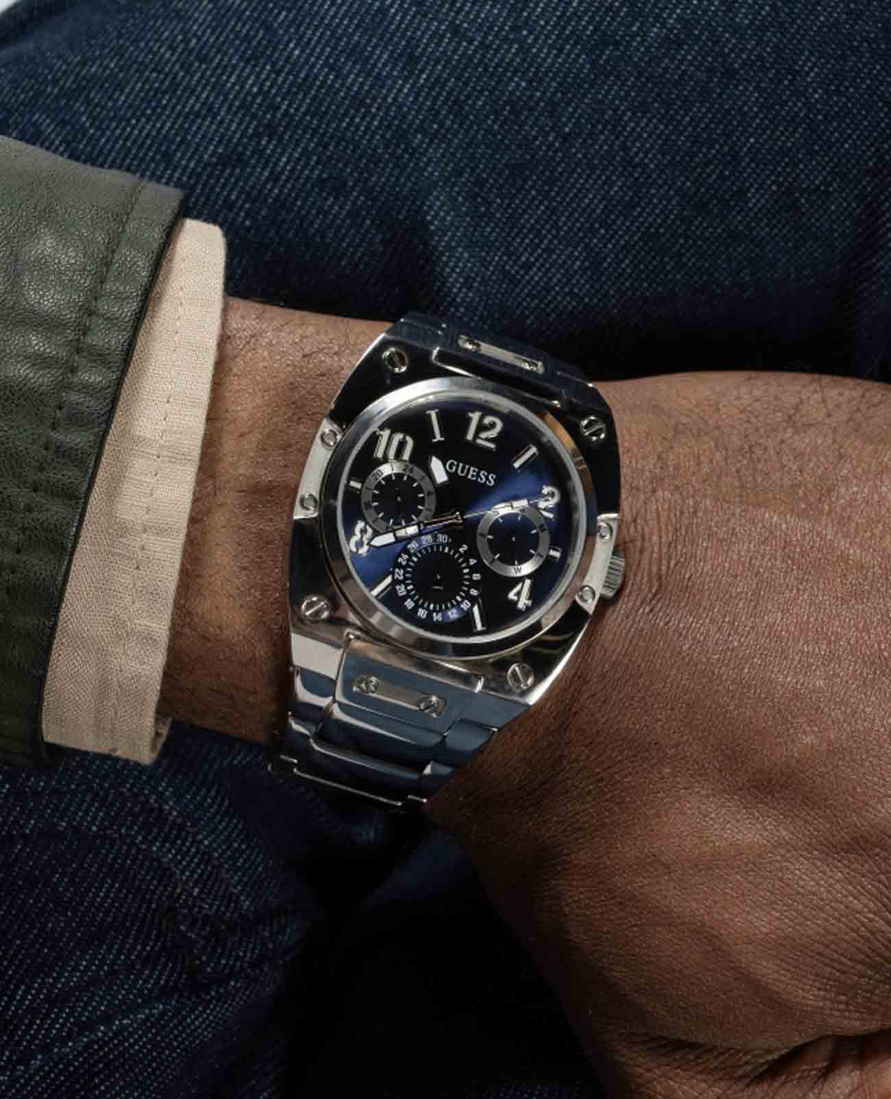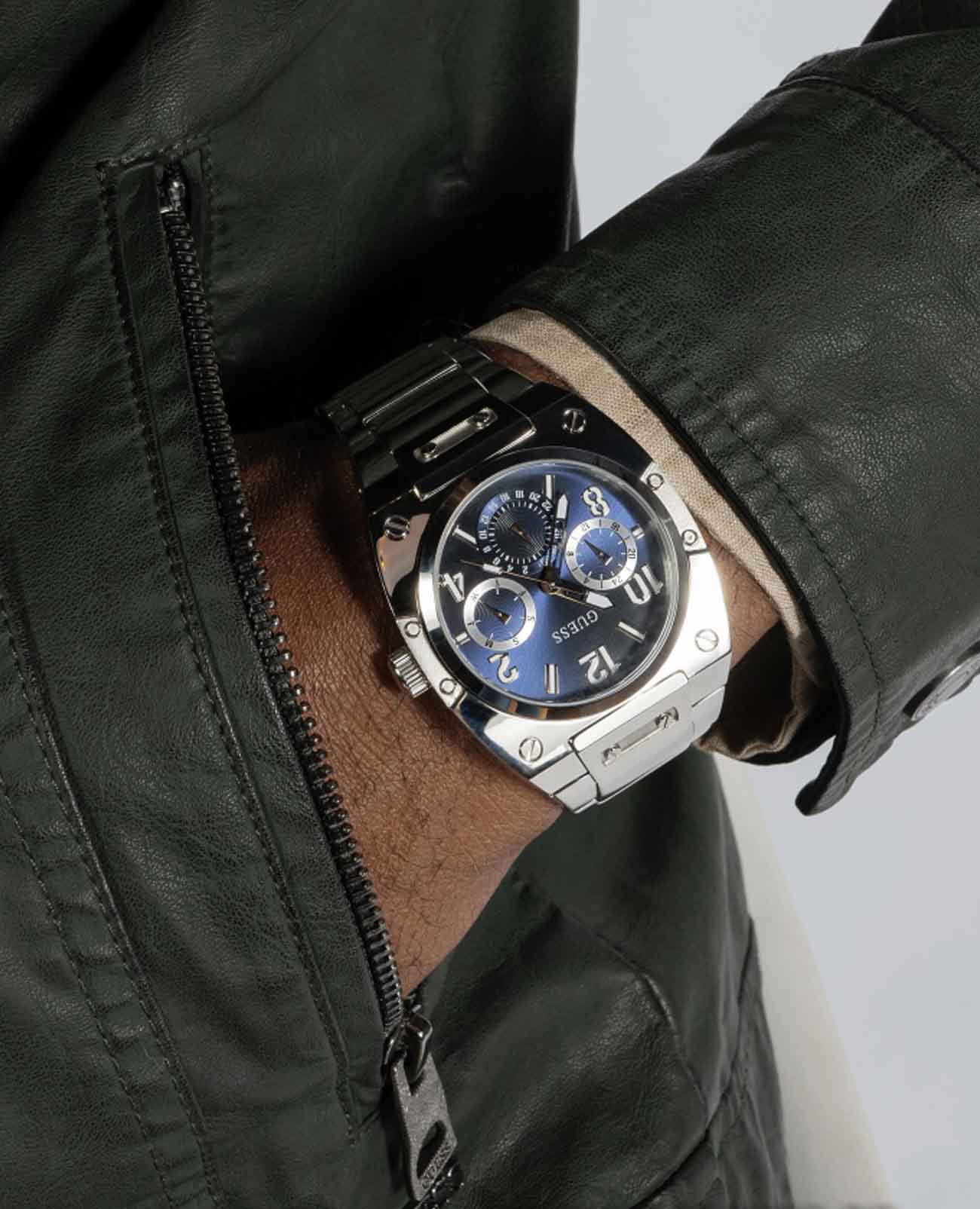 Мужские наручные часы Guess Trend GW0624G1 с минеральным стекломМинеральное стеклоМинеральное стекло представляет собой искусственно выращенный минерал кварца. Такое стекло отличается особой устойчивостью к повреждениям и царапинам. Уступает по некоторым качествам сапфировому стеклу., кварцевый механизм с высокой точностью. Корпус часов изготовлен из стали. 24-х часовой формат времени, число и день недели отображаются на отдельных циферблатах. Метки в виде арабских цифр и штрихов. Стрелки и метки с люминесцентным покрытиемЛюминесцентное покрытиеПозволяет считывать показания времени в темноте. Производители наносят на стрелки, часовые индексы, безель или поверхность циферблата светонакопительный состав, дающий холодное свечение.. Рифленая заводная головка. Класс водозащиты: 50 метров, позволит защитить корпус от случайных брызг или капель дождя. Стальной браслет на раскладной застёжкеРаскладная застёжкаТакой тип застёжки используется только на браслетах из металла. Она никогда не раскрывается полностью, происходит разделение на 2 и более частей. Раскладывающая застёжка снизит вероятность потери часов к минимуму..