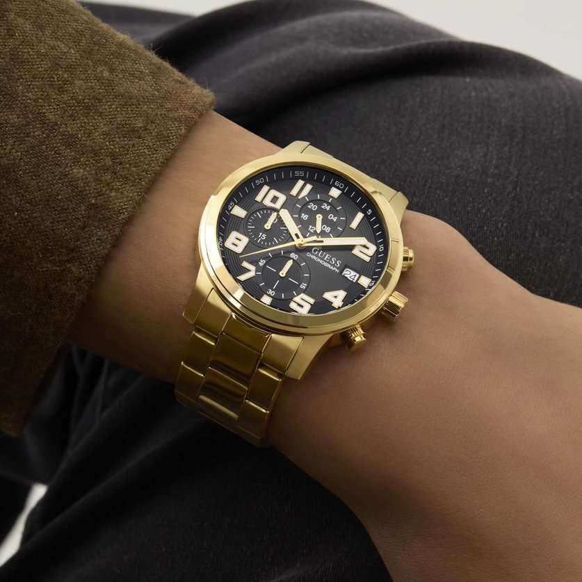 Часы Guess GW0917G2 — это стильный и функциональный аксессуар, который поможет вам всегда быть в курсе времени, независимо от обстоятельств. Эти мужские часы оснащены надежным кварцевым механизмом и имеют круглый стальной корпус с золотистым IP-покрытиемIP-покрытиеМетод ионного напыления. Демонстрирует повышенную устойчивость к истиранию, окислению и химическим веществам. Под воздействием высокого давления и температуры около 1500°C молекулы металла надёжно соединяются с частицами корпуса часов. диаметром 44 мм и толщиной 13 мм. Черный циферблат, выполненный по технологии Sunray, создает эффект солнечных лучей, добавляя глубину и элегантность дизайну. Циферблат оснащен метками в виде арабских цифр и поддерживает 12-ти и 24-х часовой формат времени, а окошко даты с днем недели, расположенное в позиции 3 часа, добавляет практичности. Отдельные циферблаты для отображения даты и дня недели делают использование часов особенно удобным. Люминесцентное покрытиеЛюминесцентное покрытиеПозволяет считывать показания времени в темноте. Производители наносят на стрелки, часовые индексы, безель или поверхность циферблата светонакопительный состав, дающий холодное свечение. на стрелках обеспечивает отличную видимость в темноте. Рифленая заводная головка обеспечивает дополнительный комфорт в эксплуатации. Стальной браслет с золотистым IP-покрытиемIP-покрытиеМетод ионного напыления. Демонстрирует повышенную устойчивость к истиранию, окислению и химическим веществам. Под воздействием высокого давления и температуры около 1500°C молекулы металла надёжно соединяются с частицами корпуса часов. и раскладной застежкойРаскладная застёжкаТакой тип застёжки используется только на браслетах из металла. Она никогда не раскрывается полностью, происходит разделение на 2 и более частей. Раскладывающая застёжка снизит вероятность потери часов к минимуму. гарантирует комфортное ношение и надежную фиксацию. Минеральное стеклоМинеральное стеклоМинеральное стекло представляет собой искусственно выращенный минерал кварца. Такое стекло отличается особой устойчивостью к повреждениям и царапинам. Уступает по некоторым качествам сапфировому стеклу. защищает циферблат от царапин и повреждений, а водозащита 50WR позволяет не беспокоиться о случайном попадании воды. Эти часы станут отличным дополнением вашего образа, подчеркивая ваш вкус и внимание к деталям.